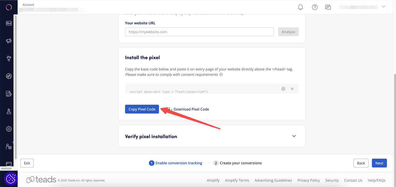 2. Select Manual Pixel, enter your website URL, then scroll down and click the "Copy Pixel Code" button to copy the code.