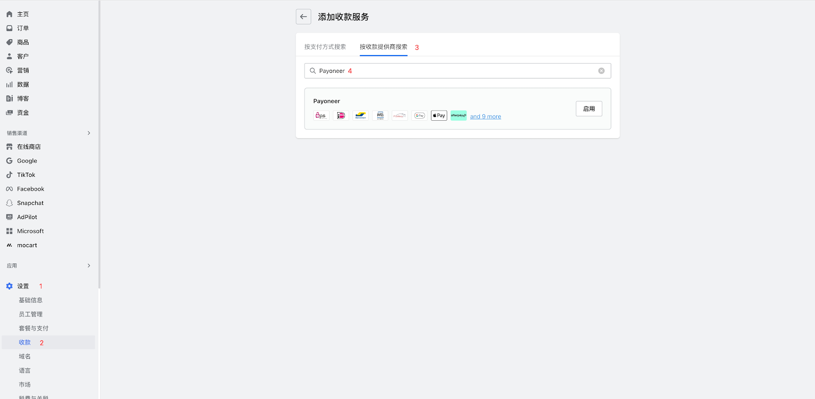 1. 登录您的 Shoplazza 管理后台,点击设置 > 收款 > 添加收款服务,按收款提供商搜索 > Payoneer。