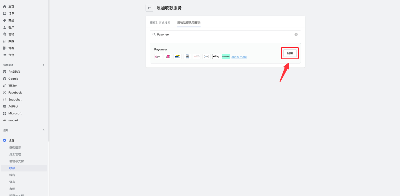 2. 在收款提供商列表选择 Payoneer,点击启用按钮,进入配置页。