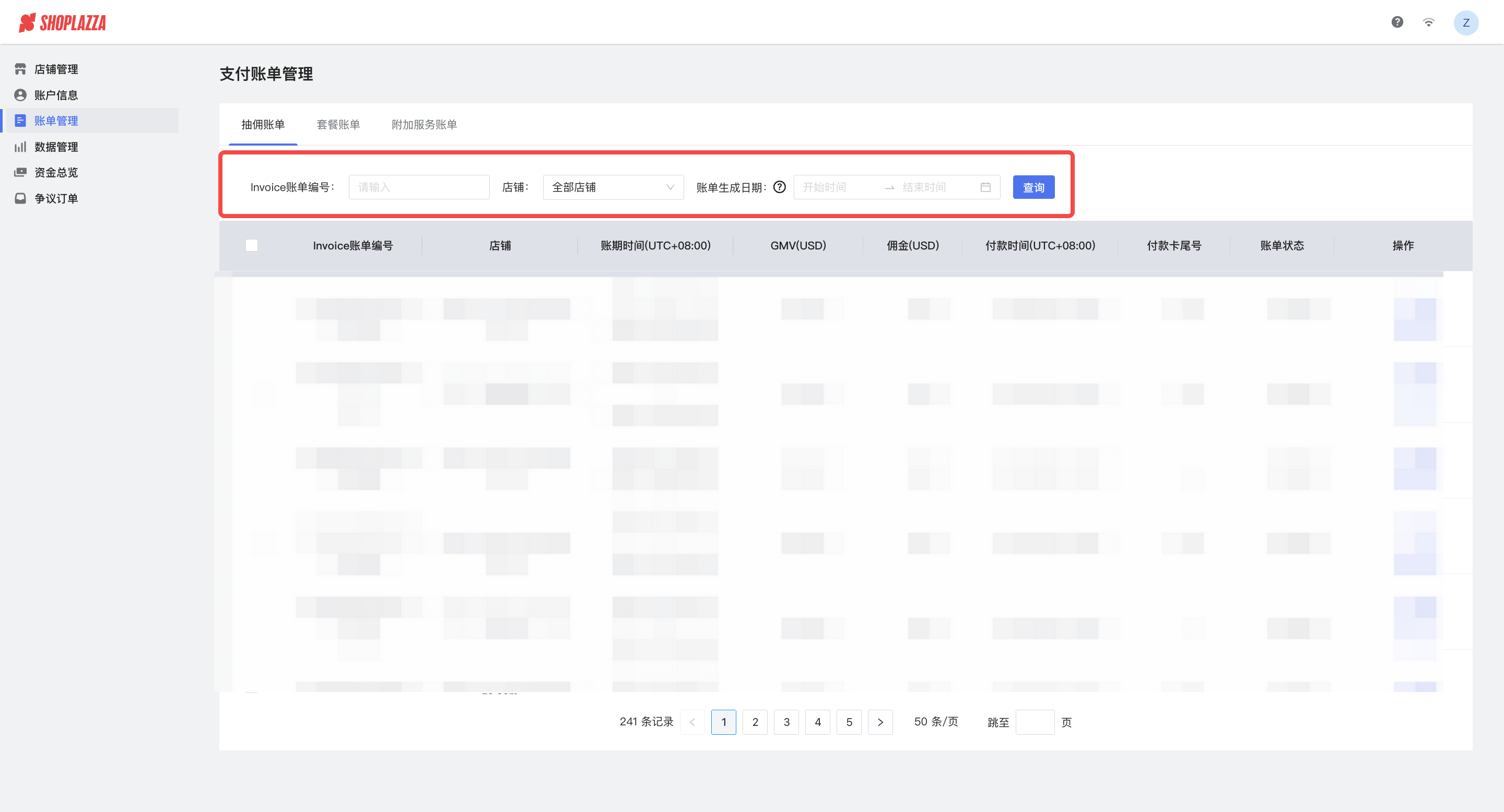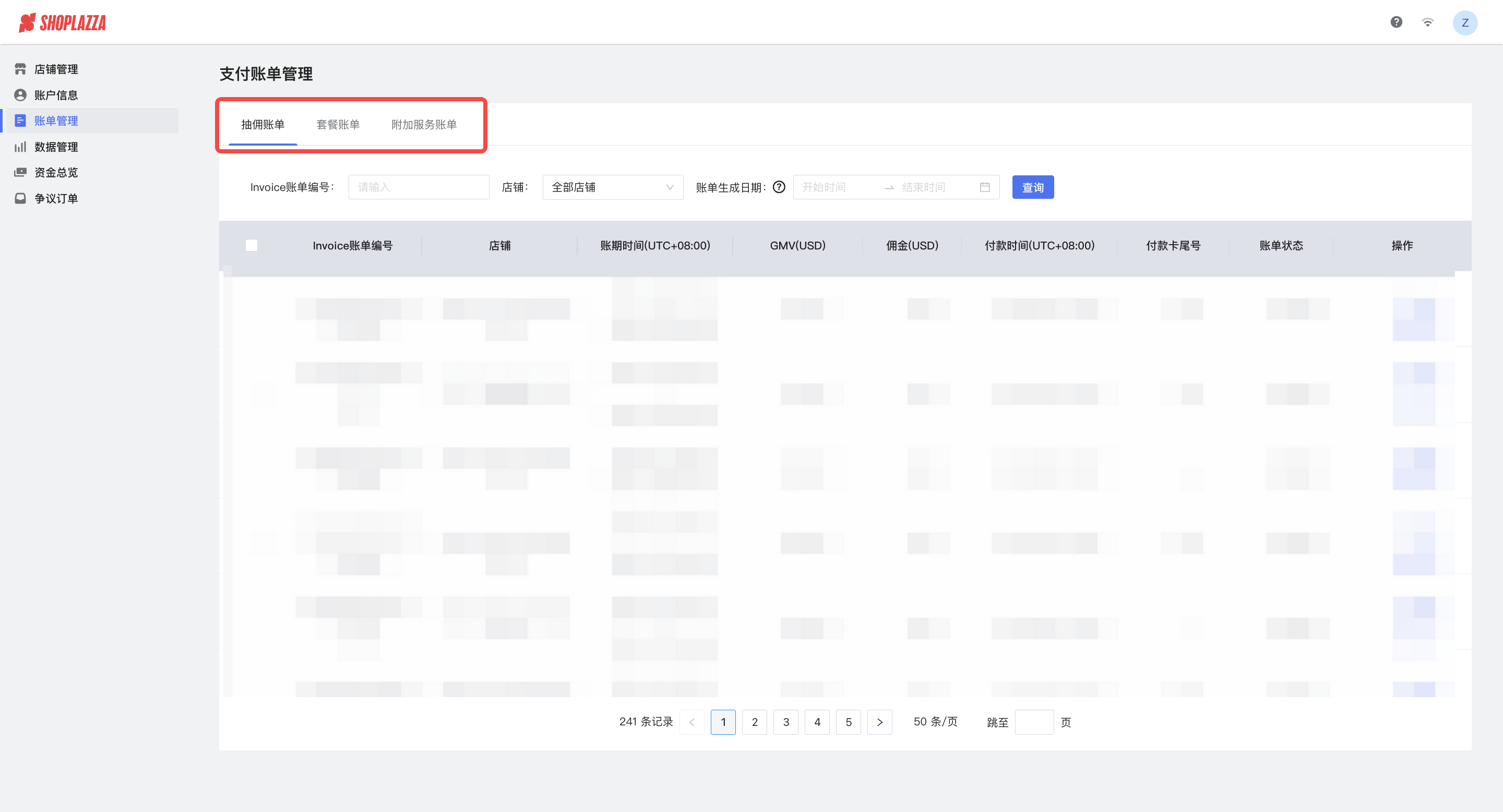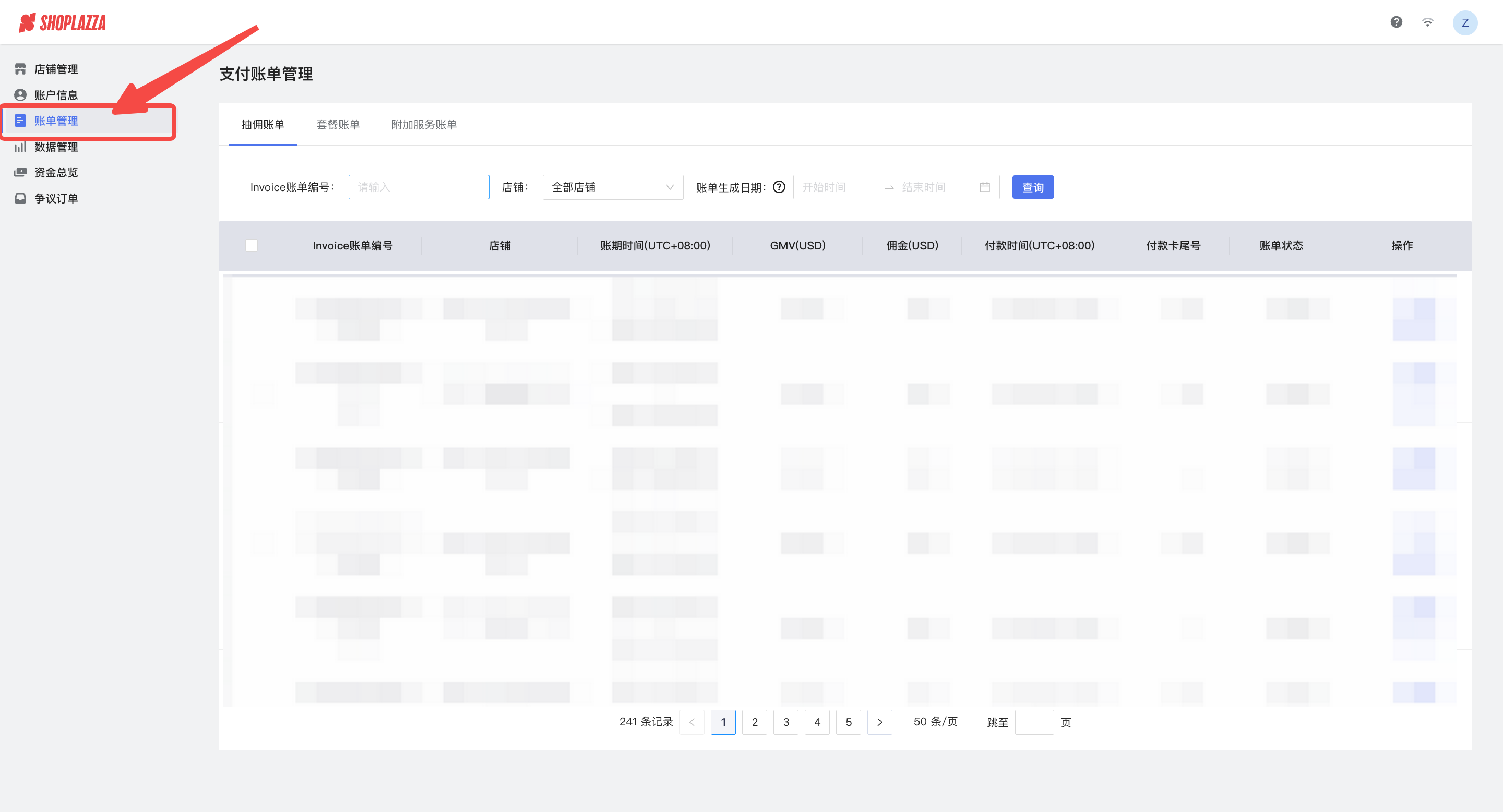 在账单管理中您可以找到现有/以前的套餐订阅账单和抽佣账单。可以有多种方式进入账单管理页面: