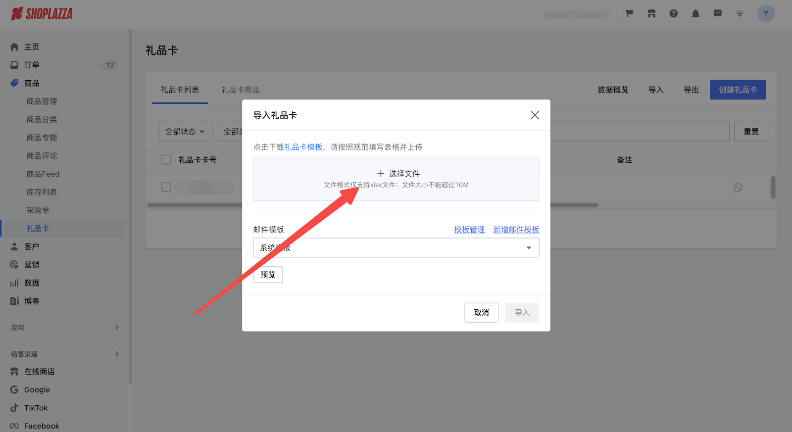 4. 文件上传成功后,选择对应礼品卡邮件模版,点击导入,将自动按照文件创建礼品卡并发放礼品卡邮件给到相应的顾客。