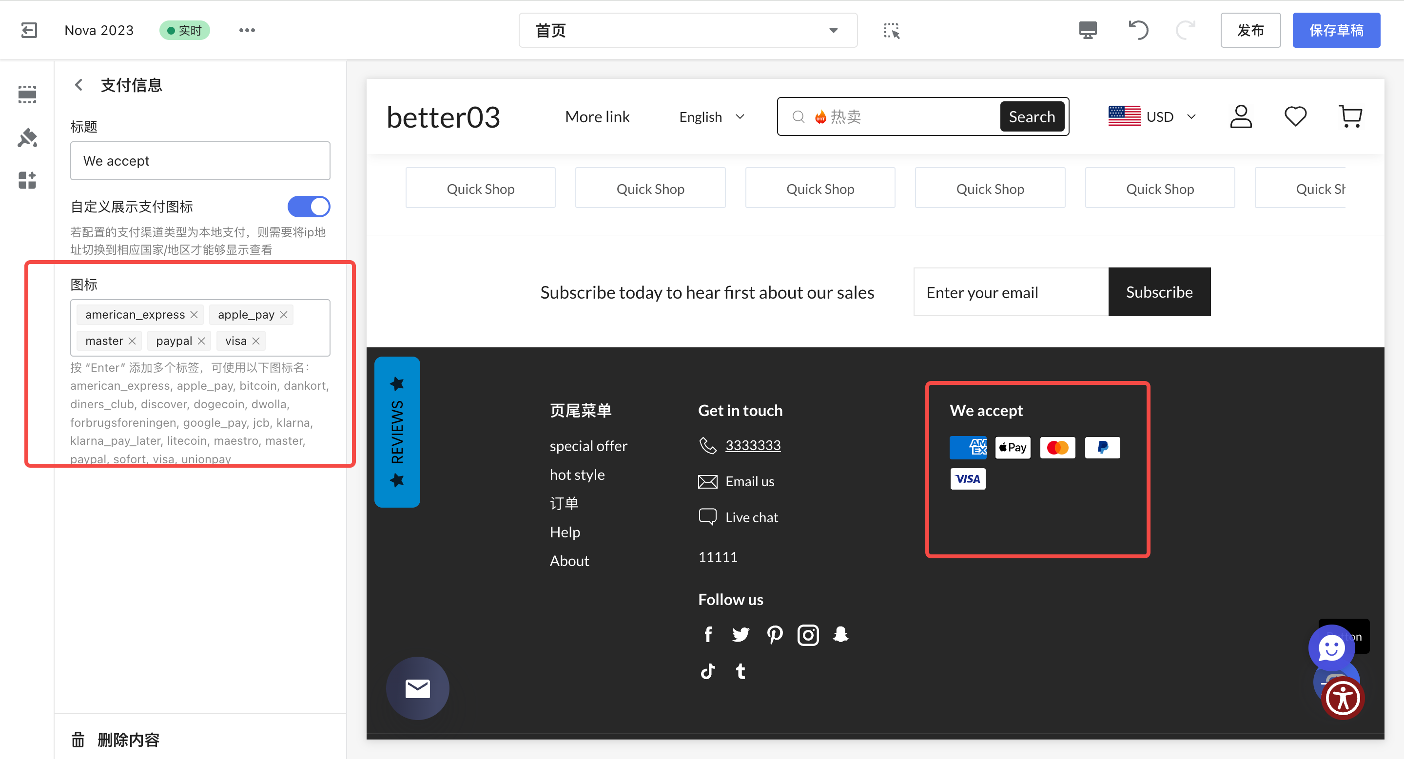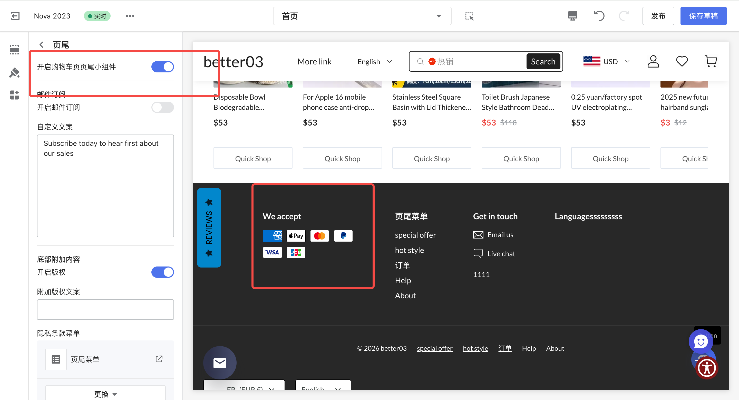 3. 开启购物车页页尾小组件,展示店铺已添加的收款方式图标。