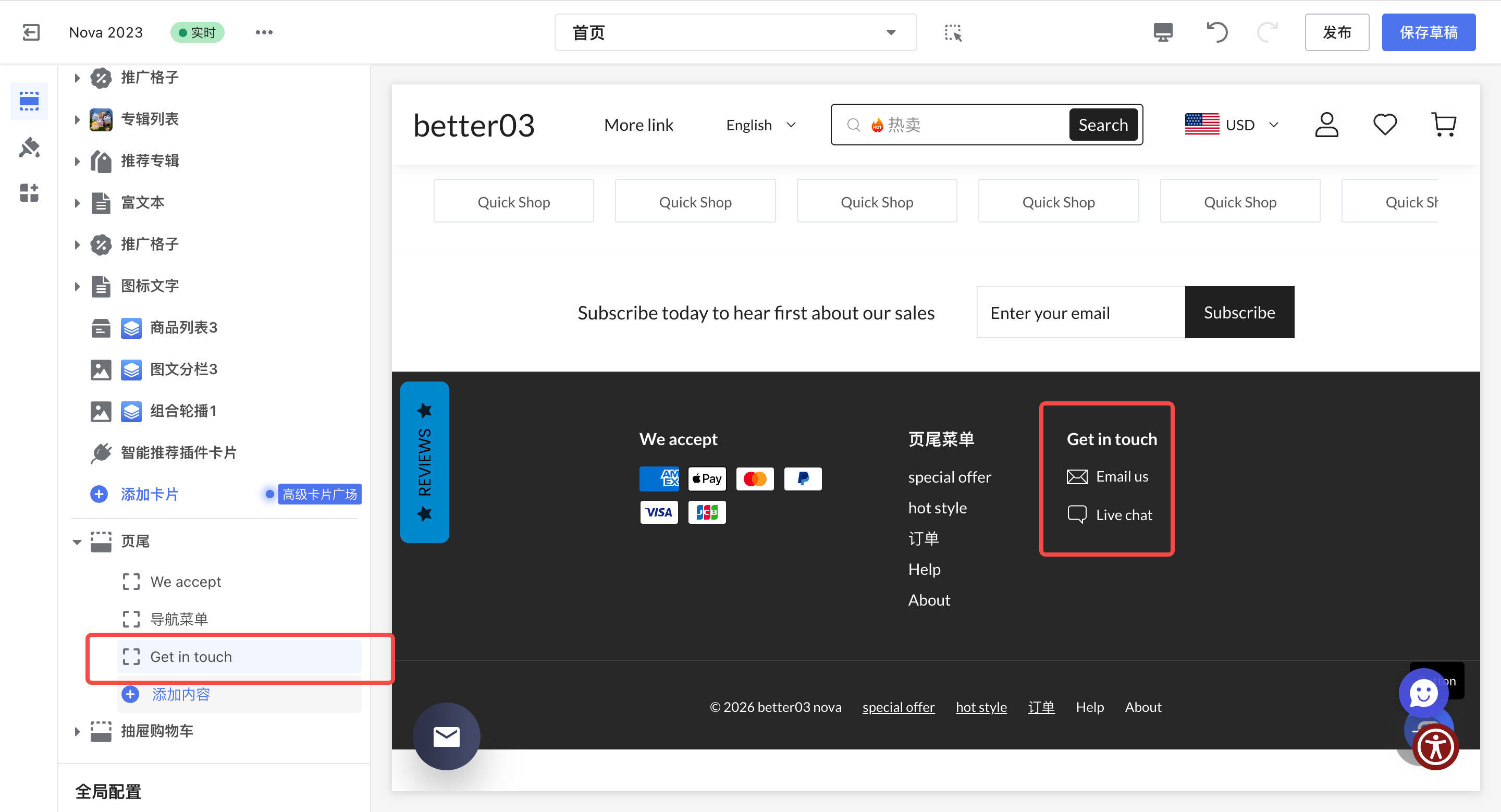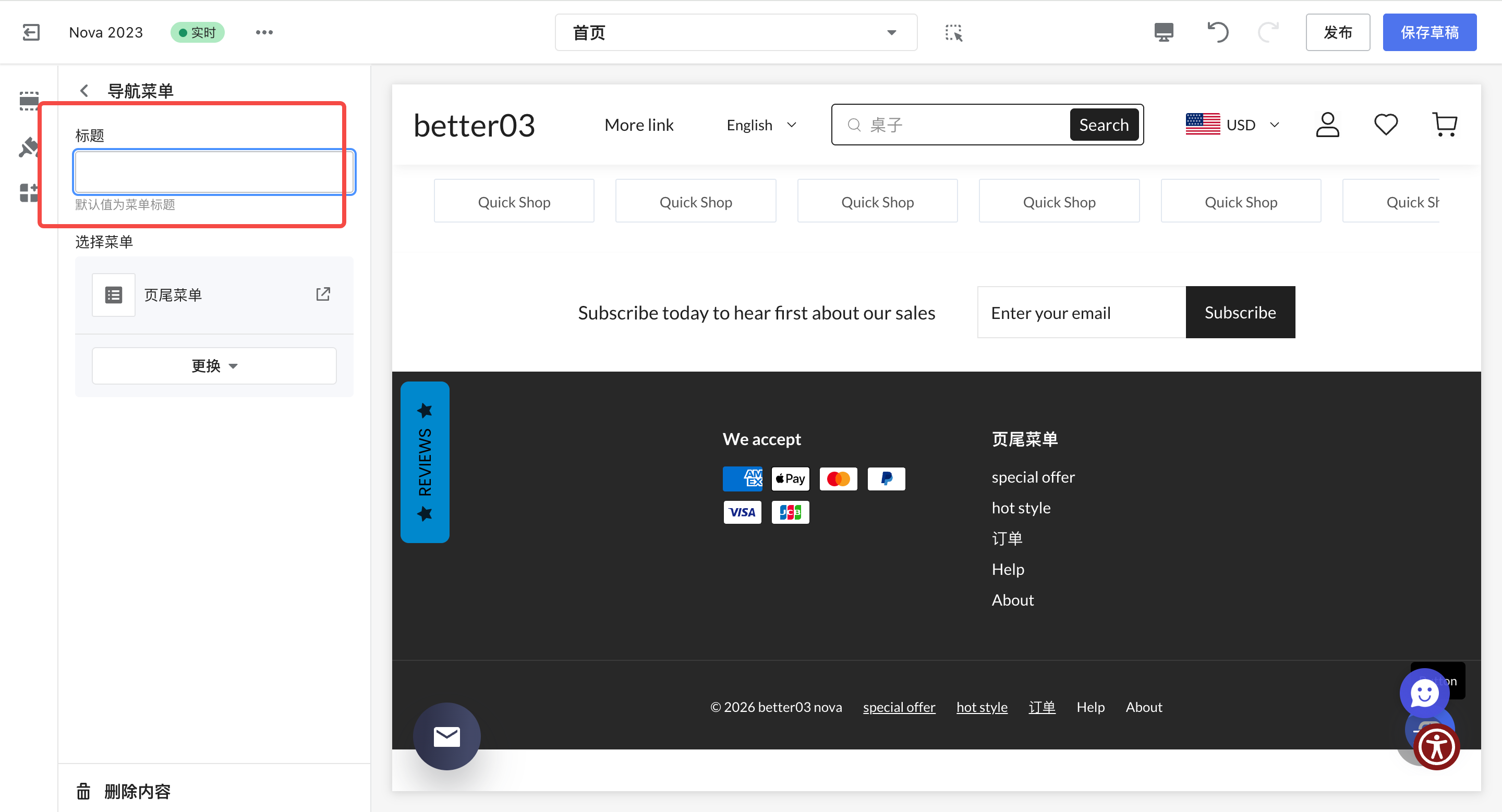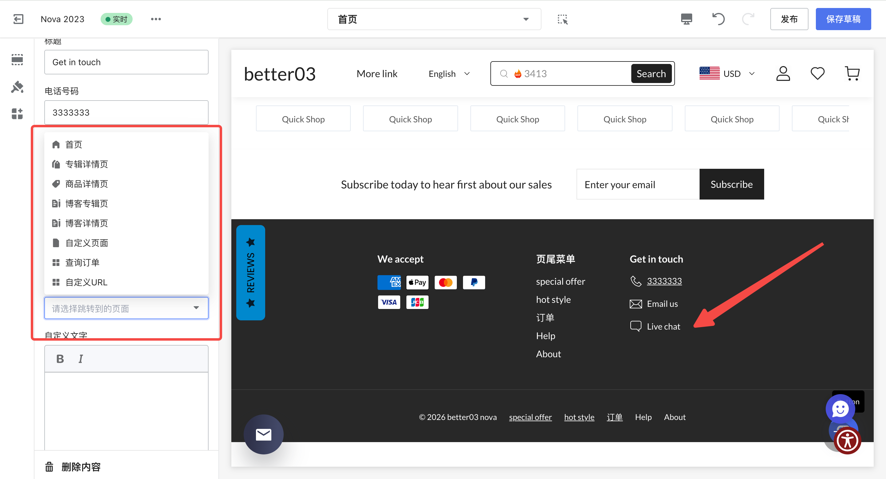 页尾菜单位于页面底部,所有页面都会在底部显示页尾菜单。页尾菜单可以链接到其他和店铺相关的页面,例如:在页尾菜单中添加您的店铺跨境电商运输政策等标题并链接到对应的自定义页面,消费者点击即可跳转展示相关信息。页尾板块可以帮助消费者快速获取店铺信息,有助于消费者对店铺建立信任以极大的提升用户体验。