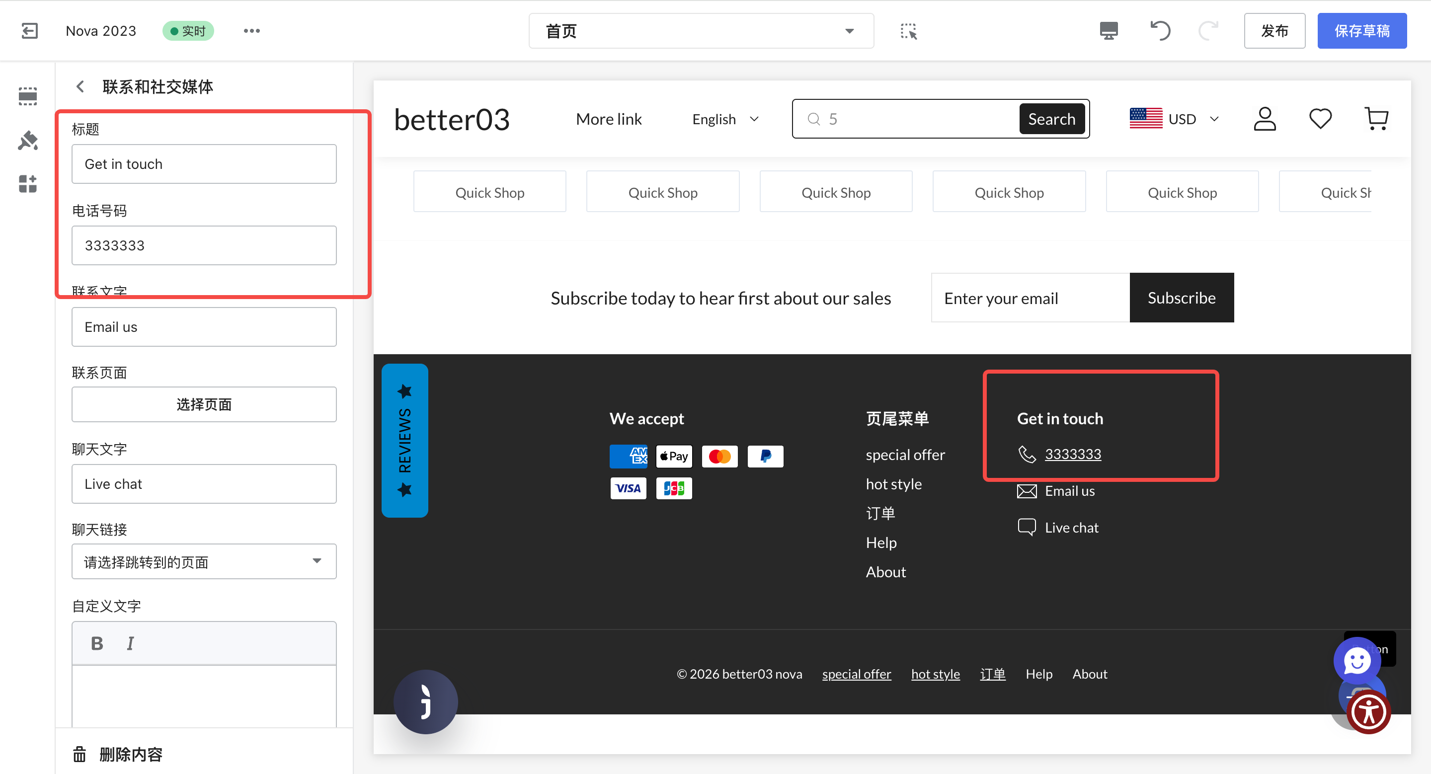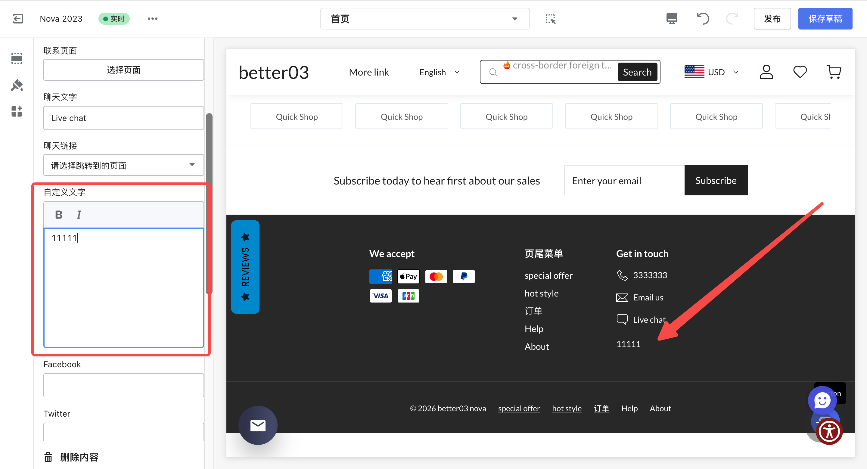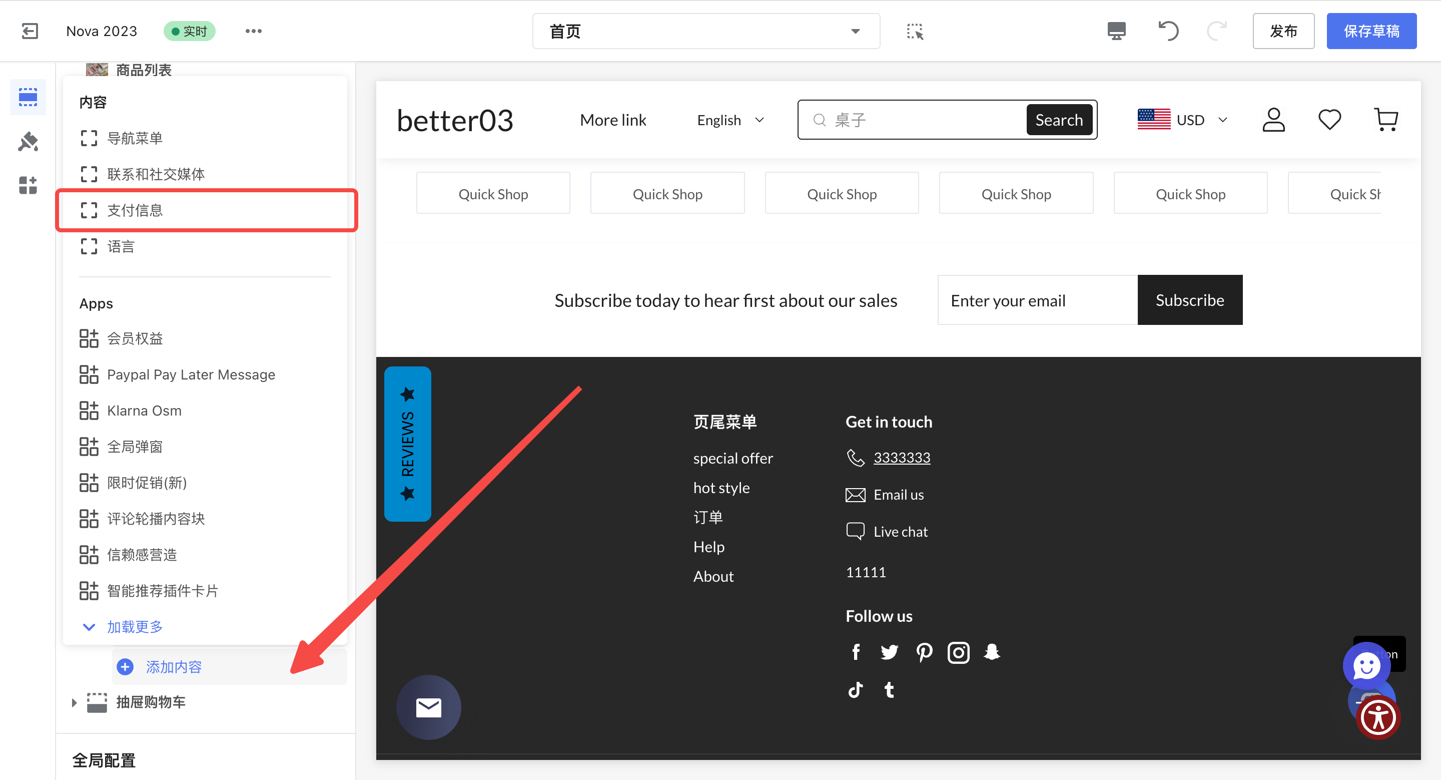 页尾菜单位于页面底部,所有页面都会在底部显示页尾菜单。页尾菜单可以链接到其他和店铺相关的页面,例如:在页尾菜单中添加您的店铺跨境电商运输政策等标题并链接到对应的自定义页面,消费者点击即可跳转展示相关信息。页尾板块可以帮助消费者快速获取店铺信息,有助于消费者对店铺建立信任以极大的提升用户体验。