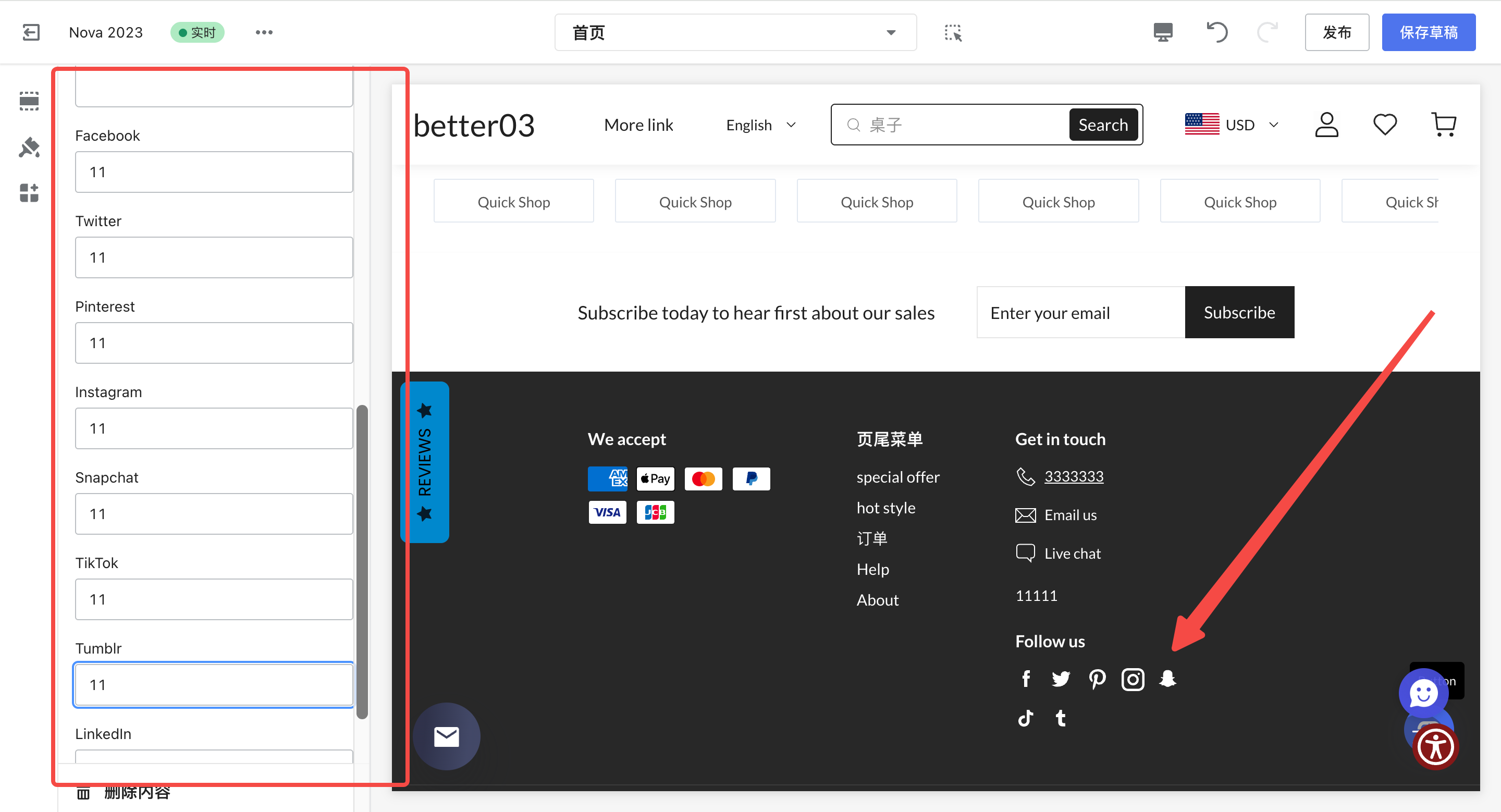6. 商家可添加多个社交媒体链接(以图标的形式展示)。