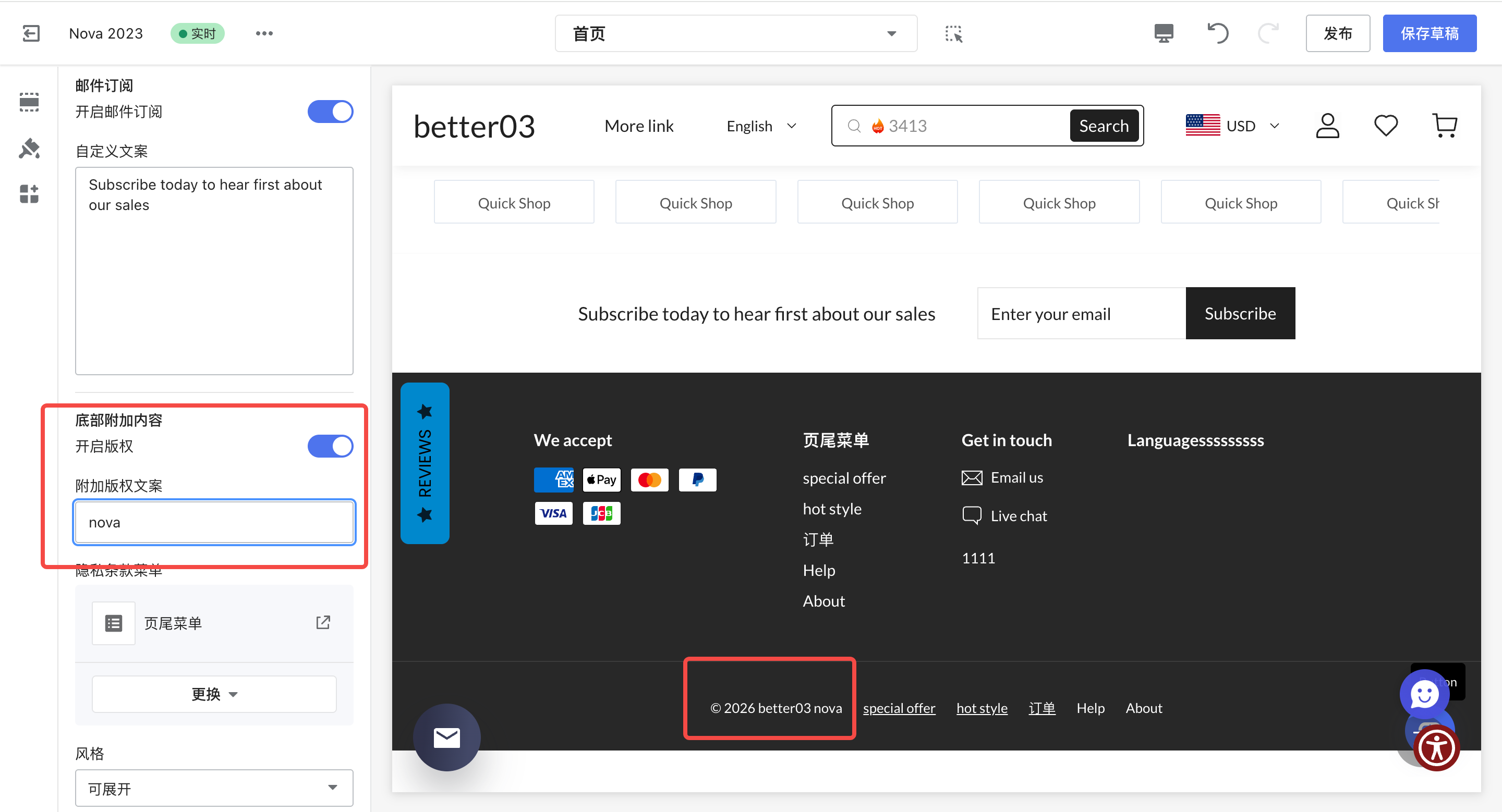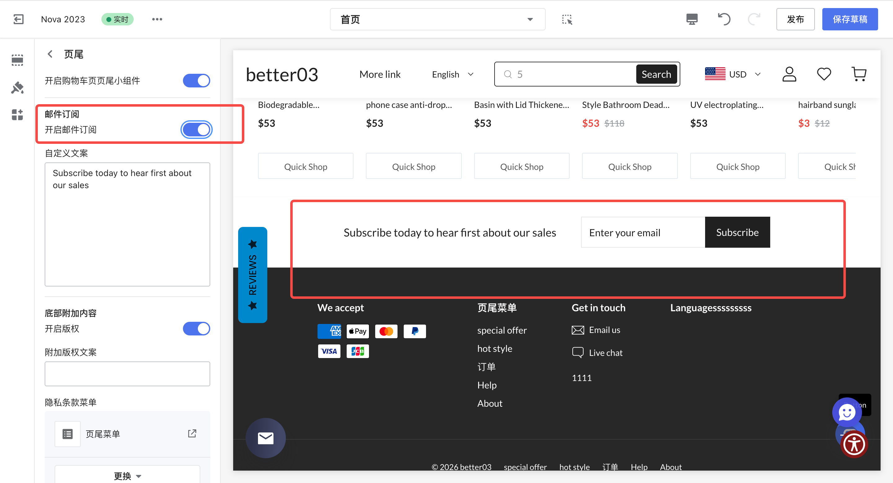 1. 开启以在页尾菜单中添加邮件订阅板块。