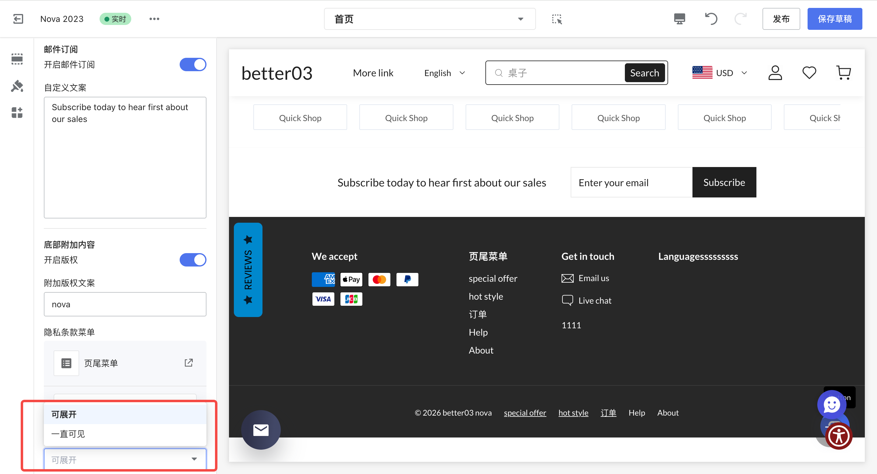 - 消费者使用小屏或移动设备访问店铺时,页尾菜单会被压缩为适应屏幕大小的垂直布局。可选“一直可见”或“可展开”的展示风格。