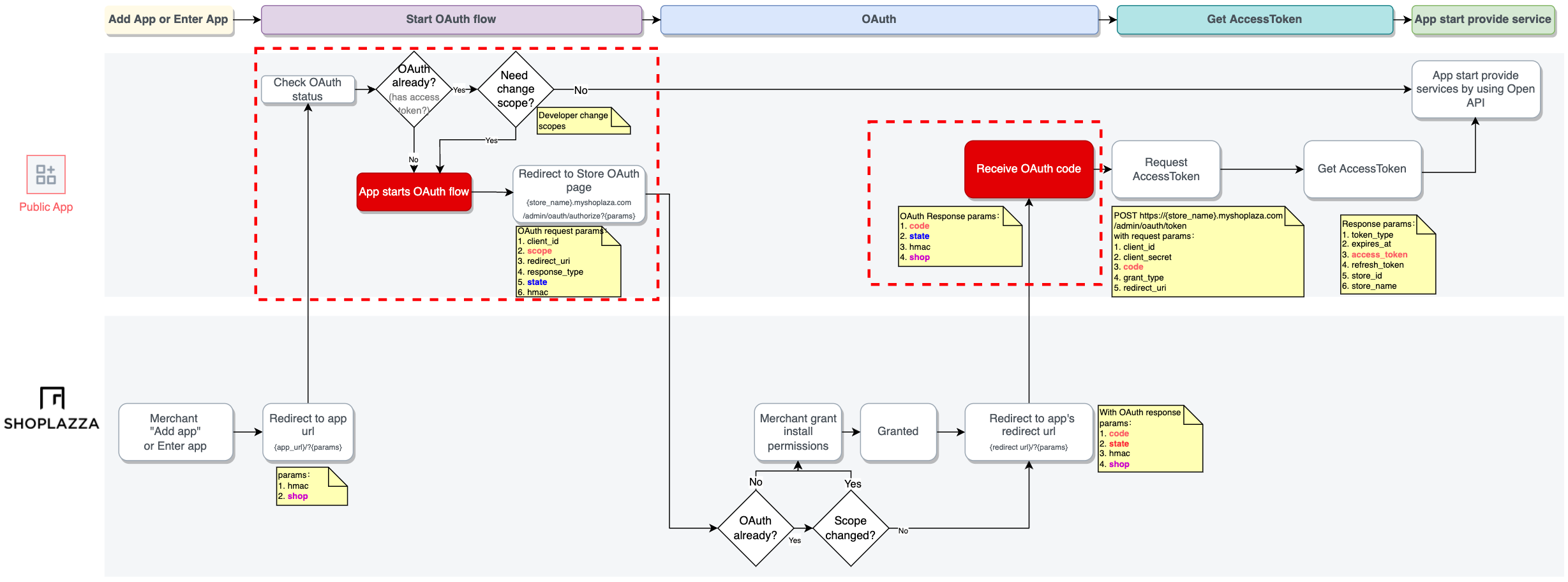 也就是说,在Shoplazza平台中,标准的OAuth流程,应该由App来发起OAuth流程,所以Shoplazza平台出具以下的Shoplazza平台标准的OAuth流程和迁移指南给开发者做迁移的参考,如下: