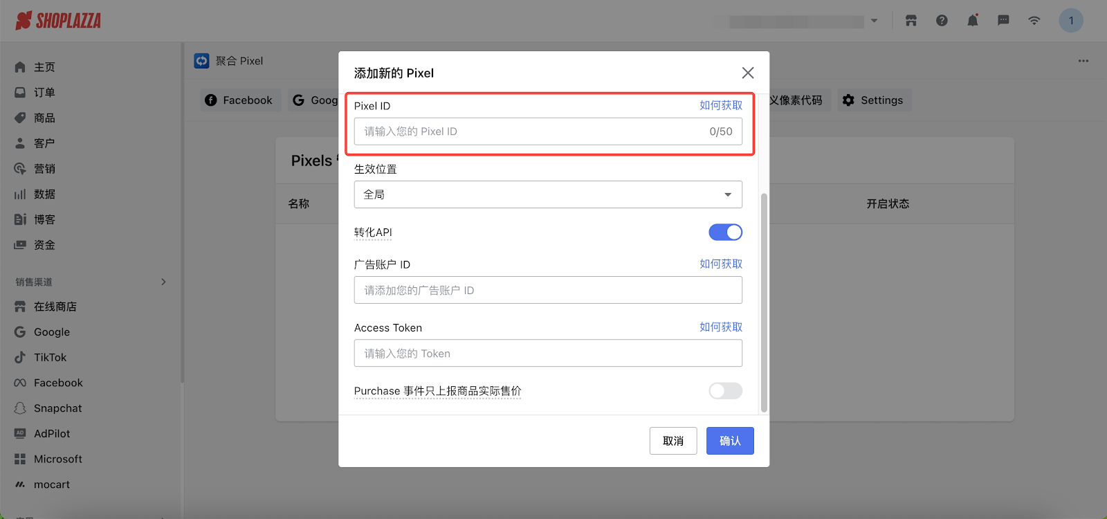 3. 返回 Shoplazza 管理后台,将复制的 ID 粘贴到聚合Pixel > 其他渠道 > 添加 > 渠道选择 Pinterest 在窗口填写Pixel名称、Pixel ID以及选择生效位置。
