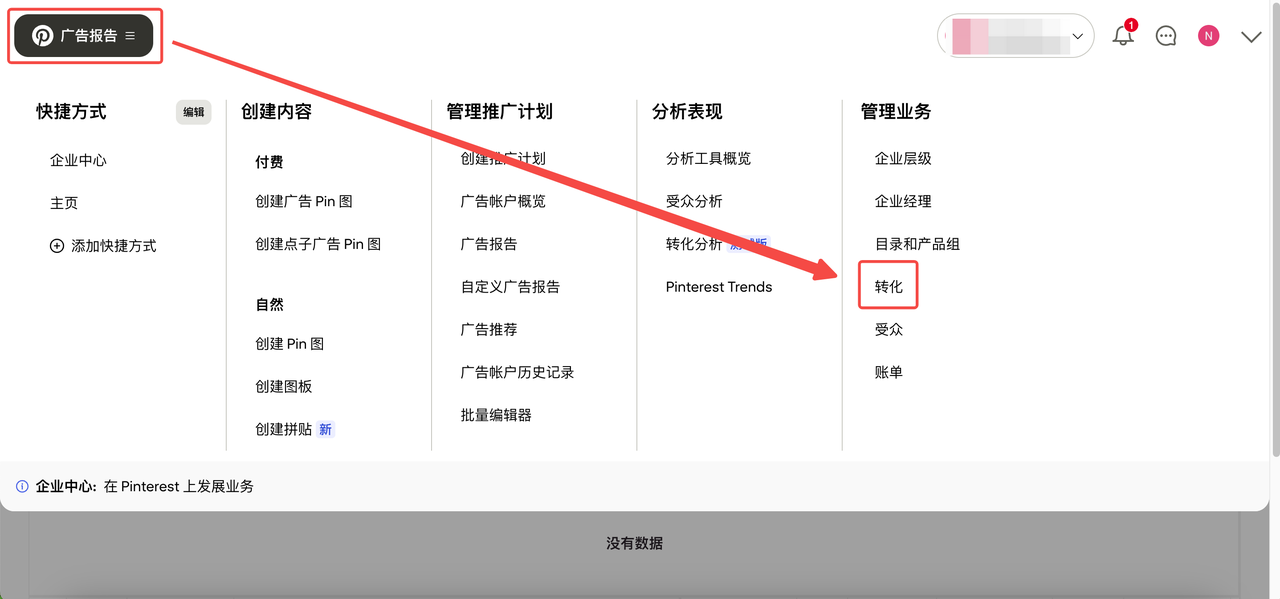 1. 前往Pinterest Ads 后台获取 Tag ID。登录或注册后,点击广告 > 转化继续下一步。