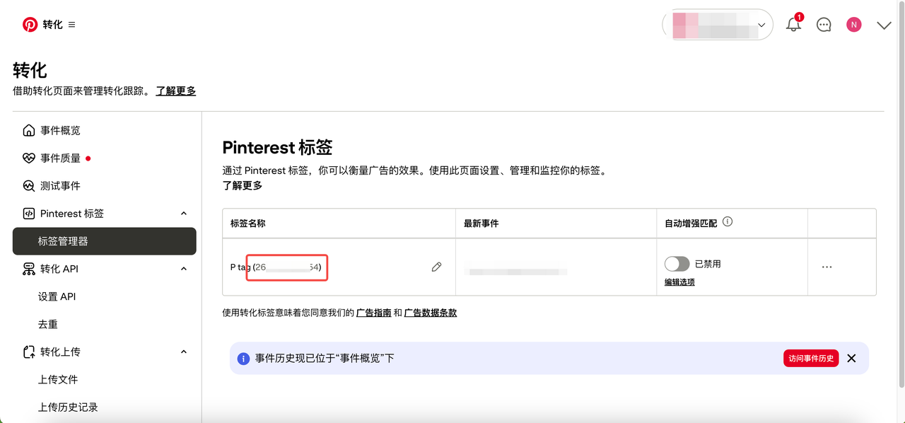 5. 如需继续安装转化API,请参考:聚合Pixel | 获取 Pinterest 广告账户 ID&聚合Pixel | 获取 Pinterest 转化 API Access Token。