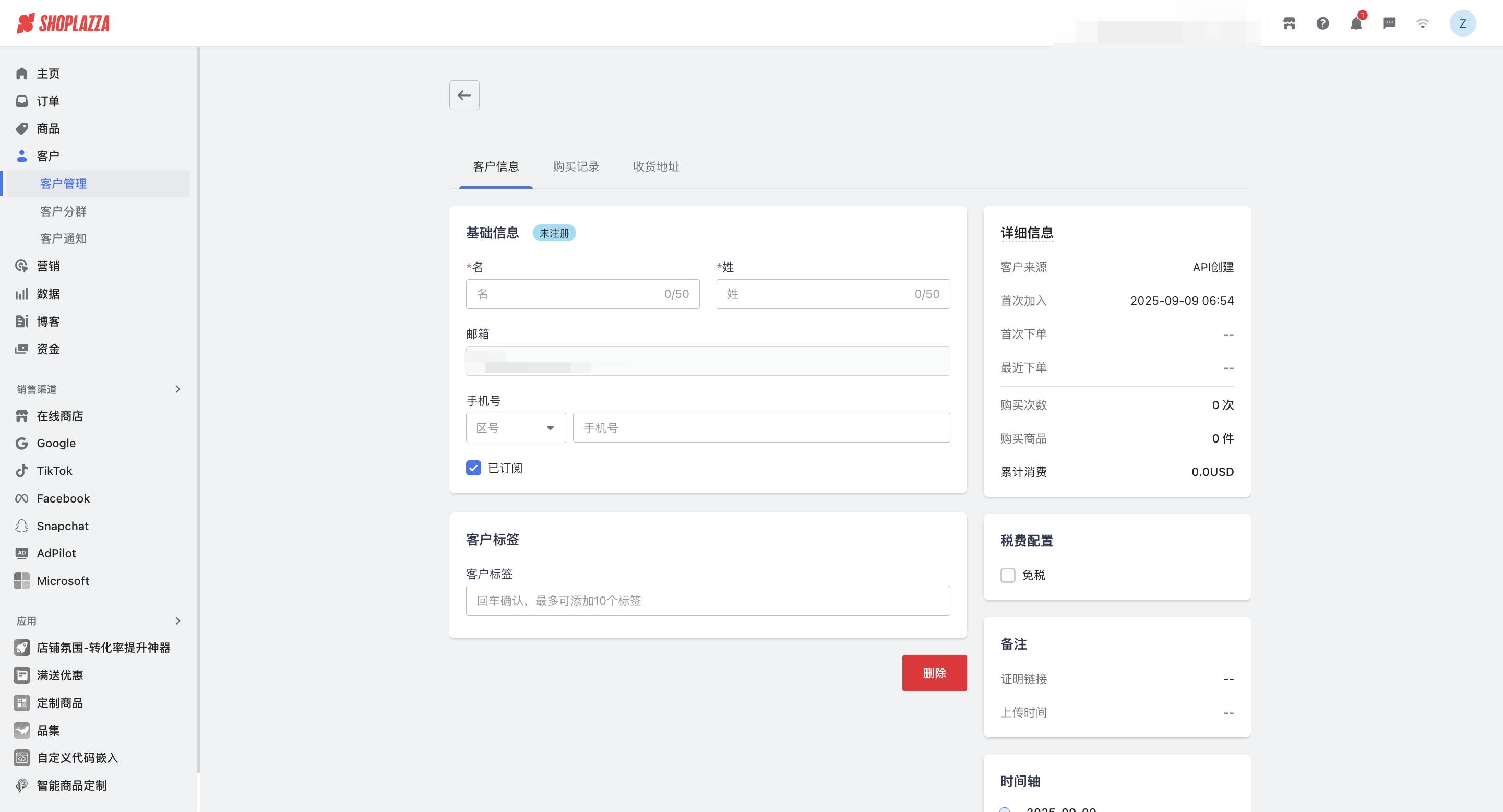1. 登录您的 Shoplazza 管理后台,点击客户 > 客户管理 > 新建客户,手动创建客户信息。