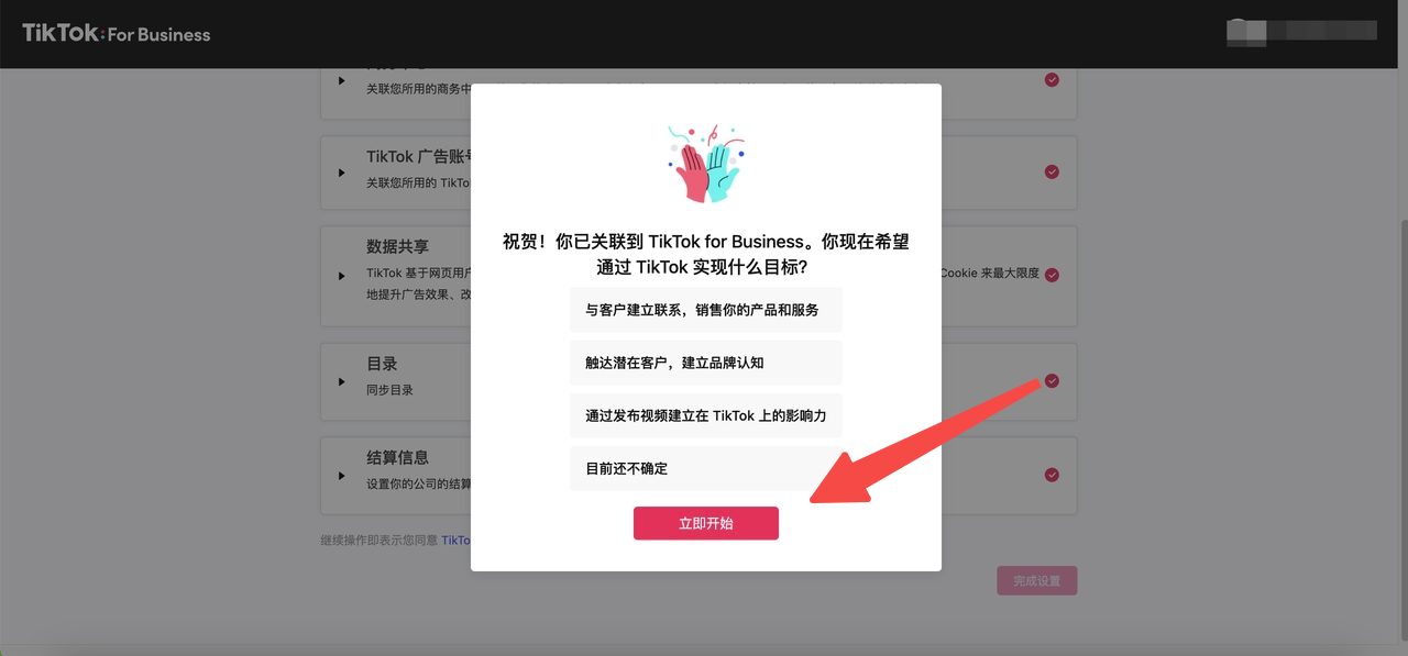 4. 以上内容配置完成后,点击完成设置,完成 TikTok 相关账号及资产关联。