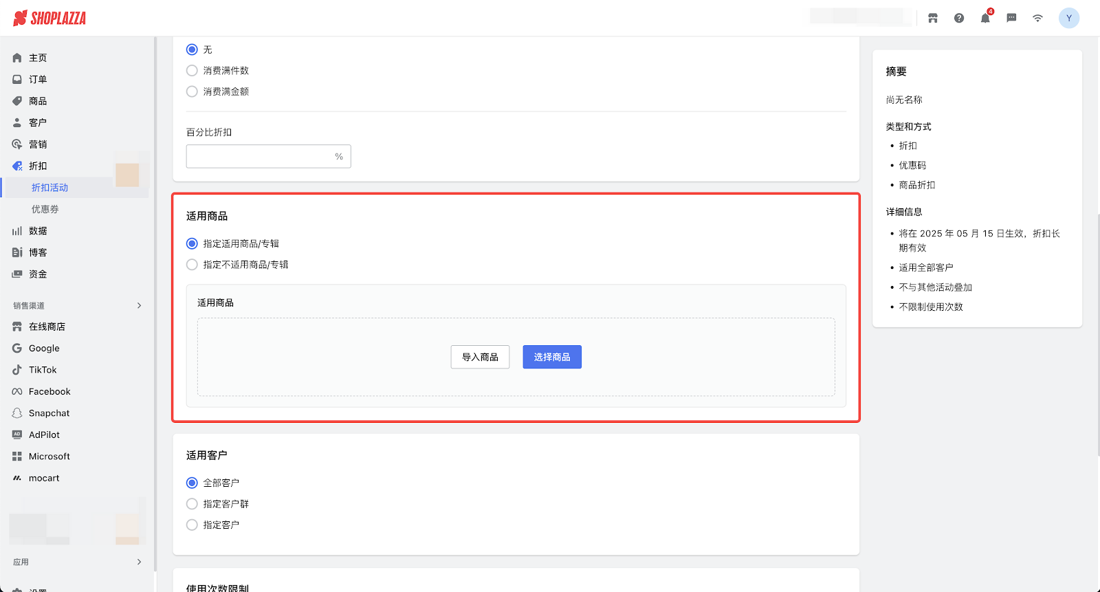 Step4. 配置适用商品(仅商品维度的活动需要配置,订单维度的活动默认为全部商品)