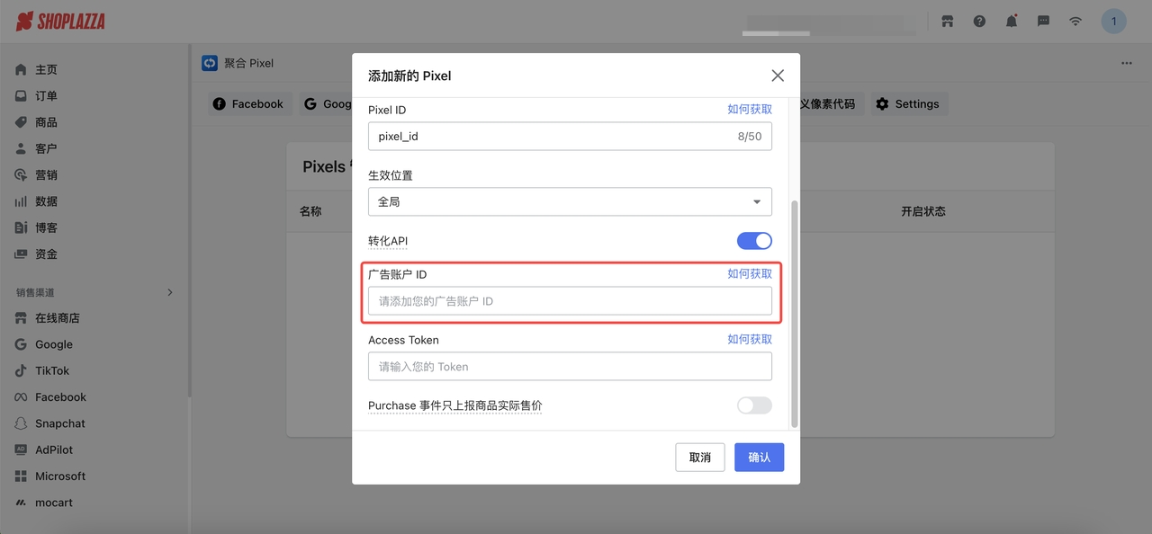 3. 将复制的 ID 粘贴到聚合Pixel > 其他渠道 > 添加 > 渠道选择 Pinterest > 打开转化API 粘贴至对应 广告账户 ID 位置即可。