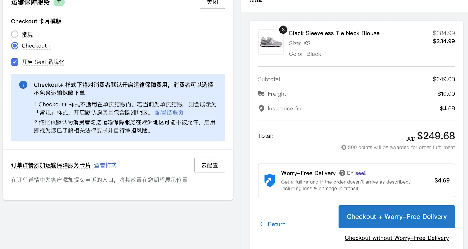- 开启后,运输保障的说明卡片将展示 Seel 官方品牌视觉,可增强可信度与转化率。