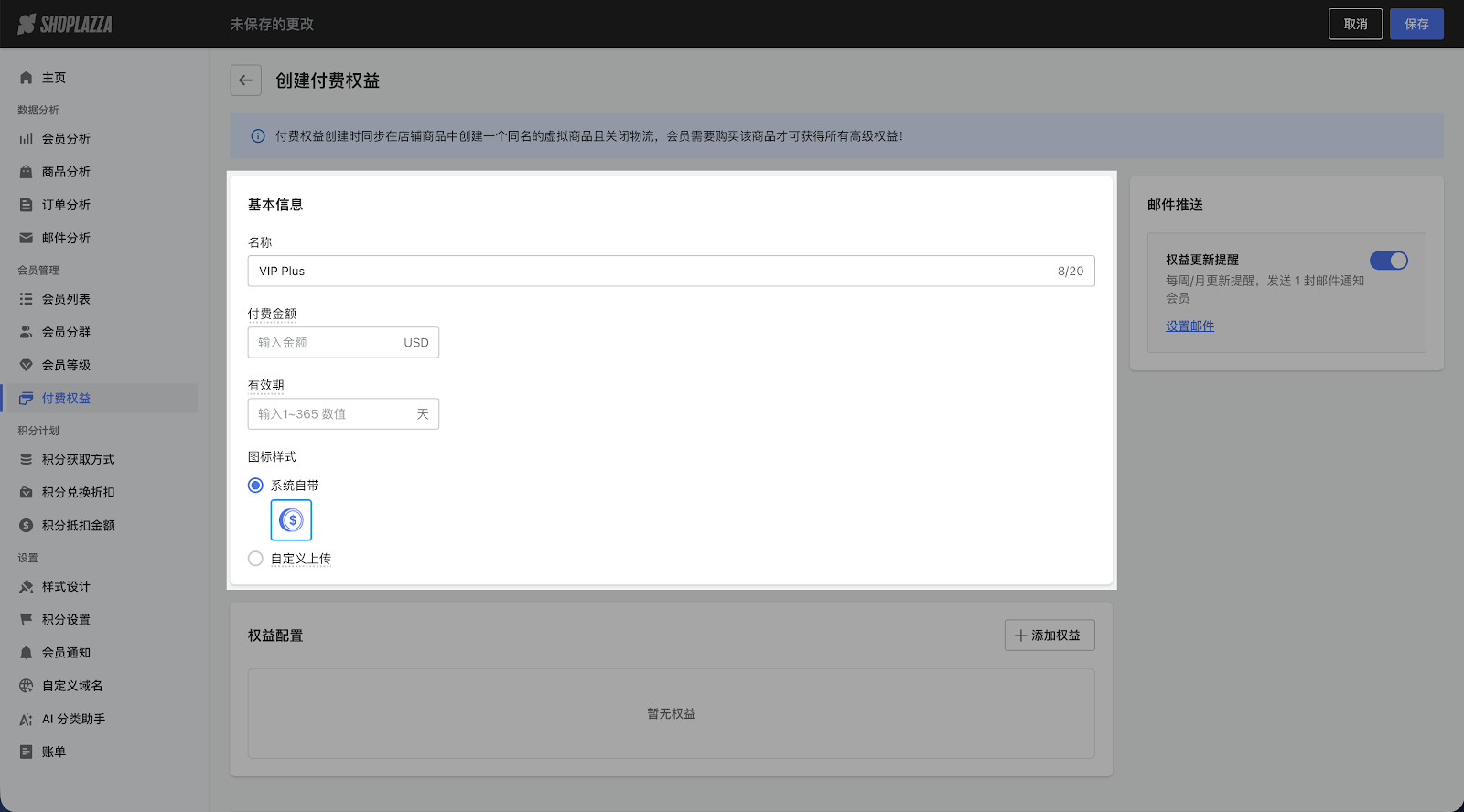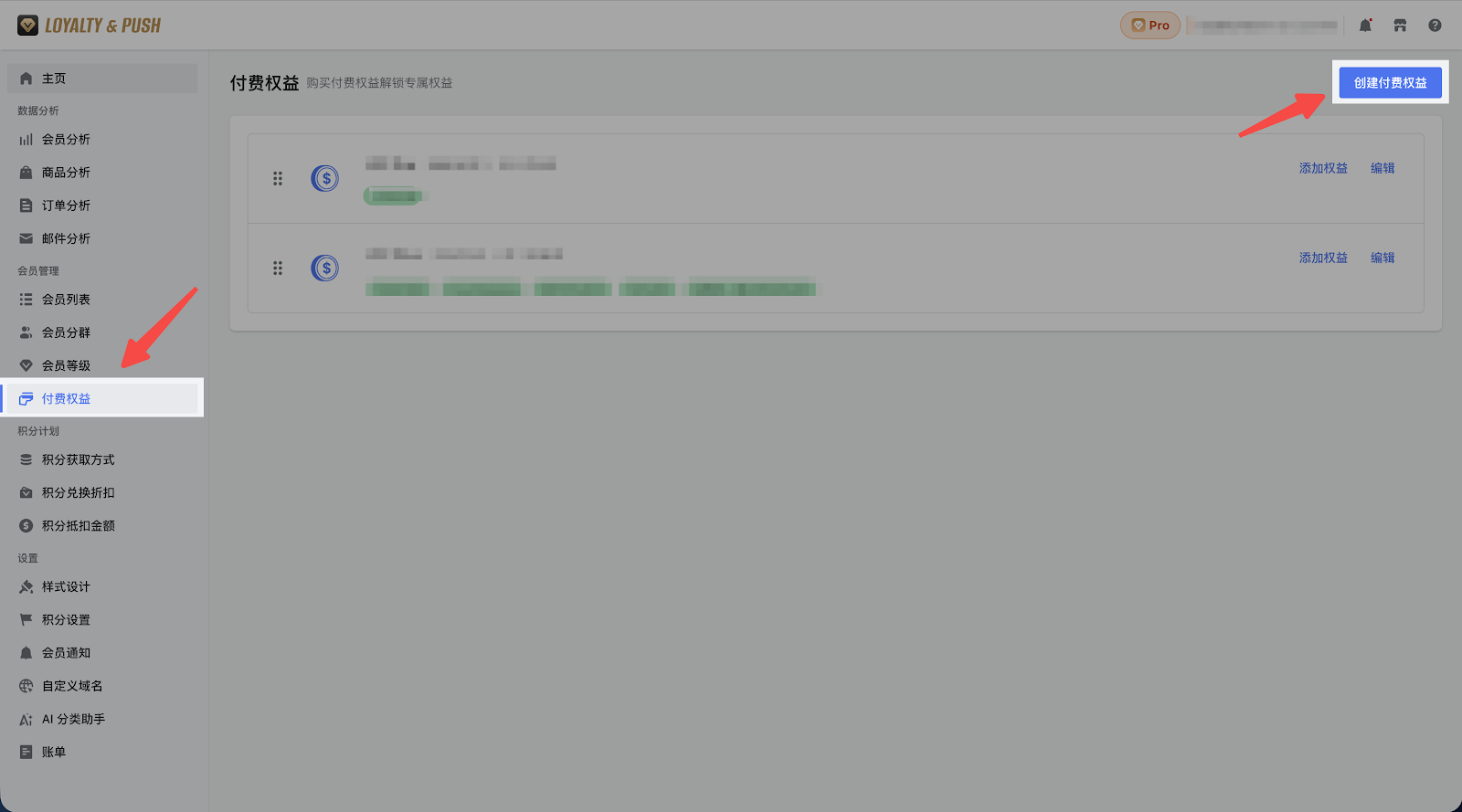 1. 打开您的 Loyalty&Push 管理后台,点击会员管理 > 付费权益进入权益列表页面,点击创建付费权益 > 进入创建页面。