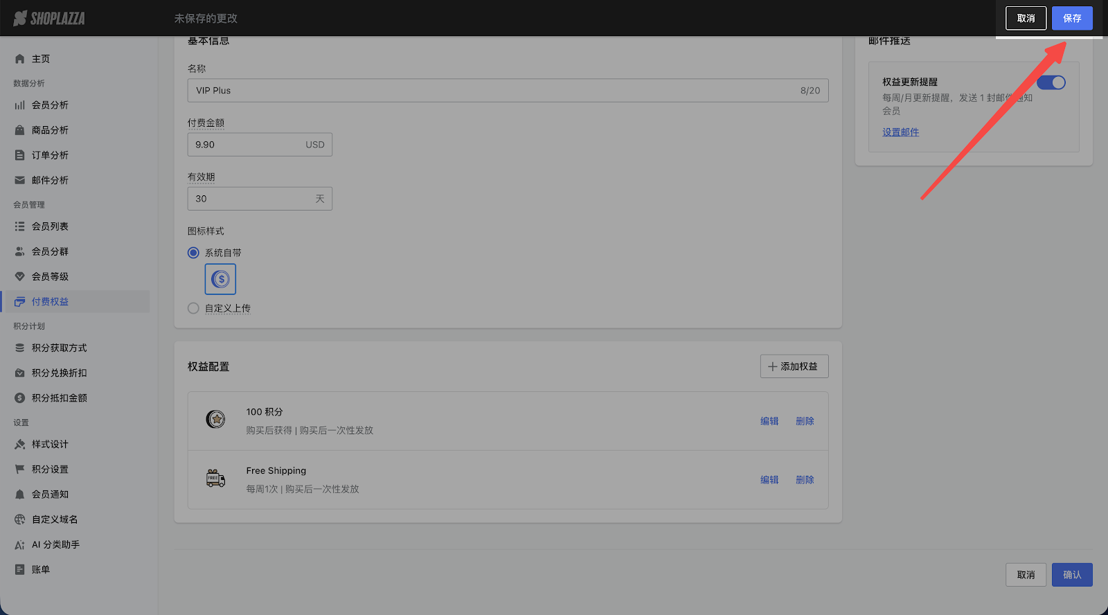 4. 填写完基本信息和添加权益后,点击【保存】成功创建付费权益。