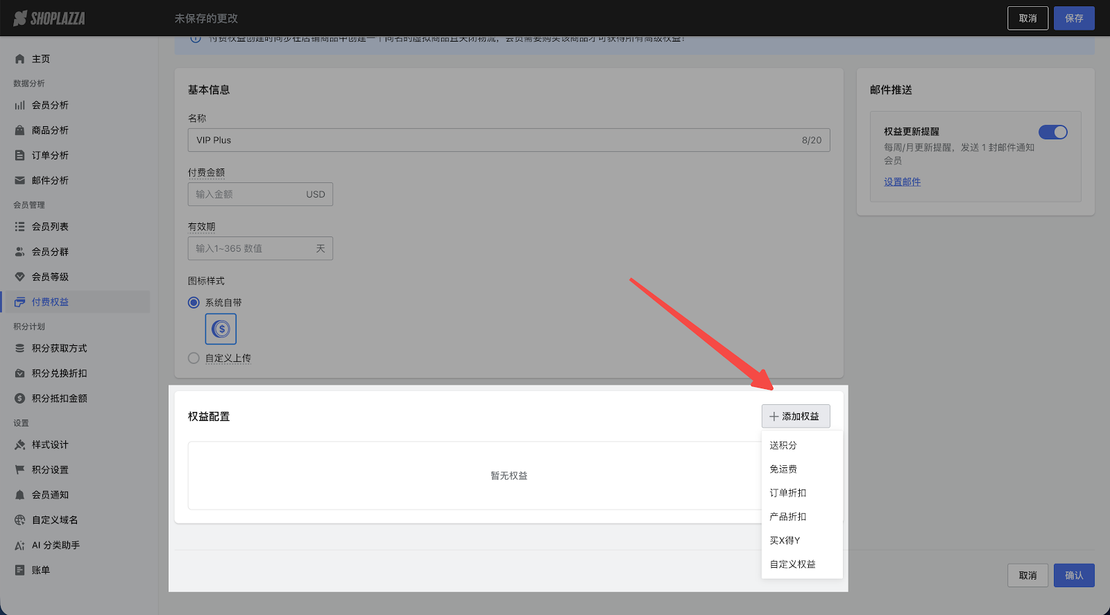 3. 添加权益内容: