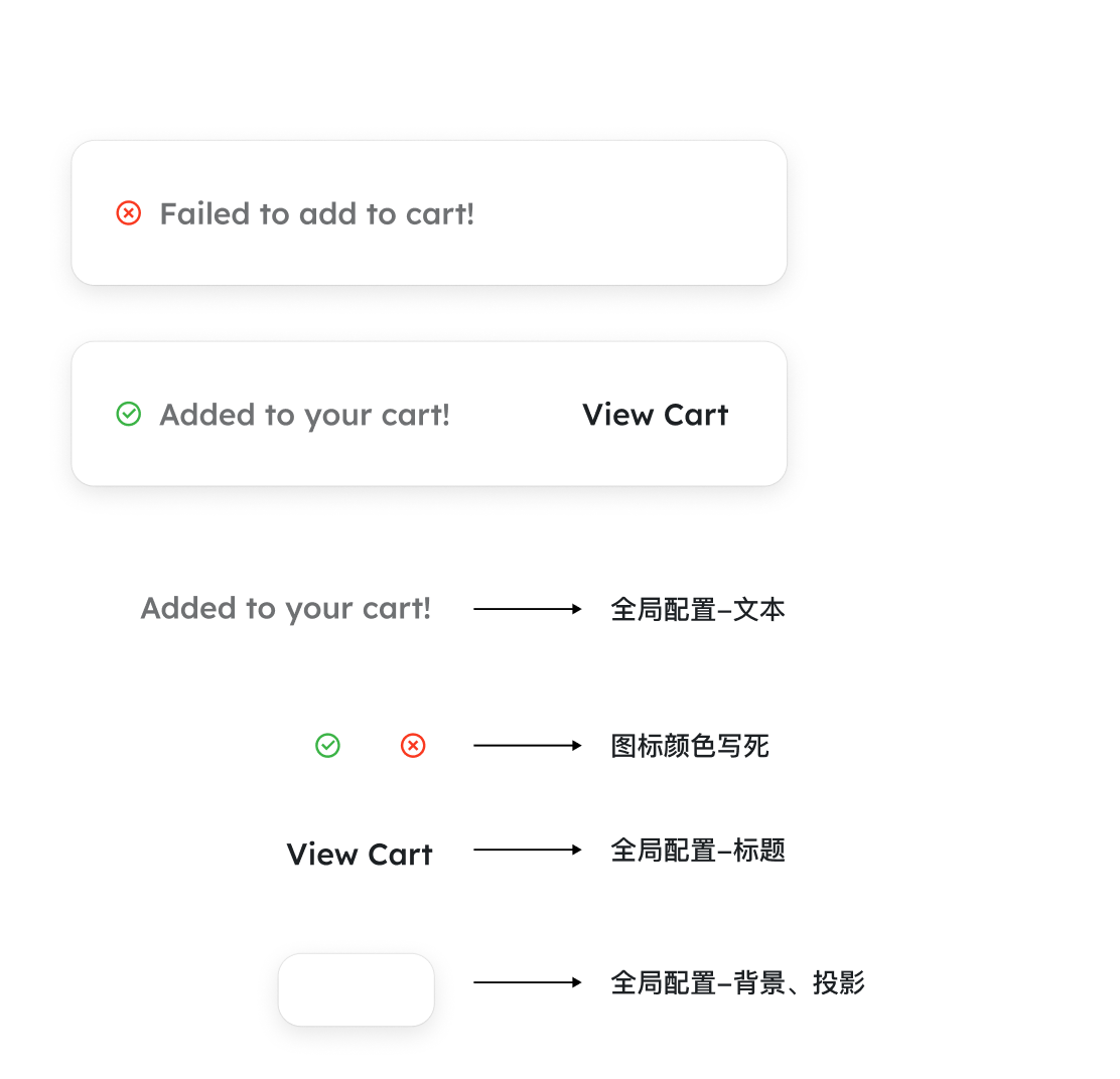 | 加购成功 | 全局文本、标题、背景、投影 图标写死颜色 | ![]() | |