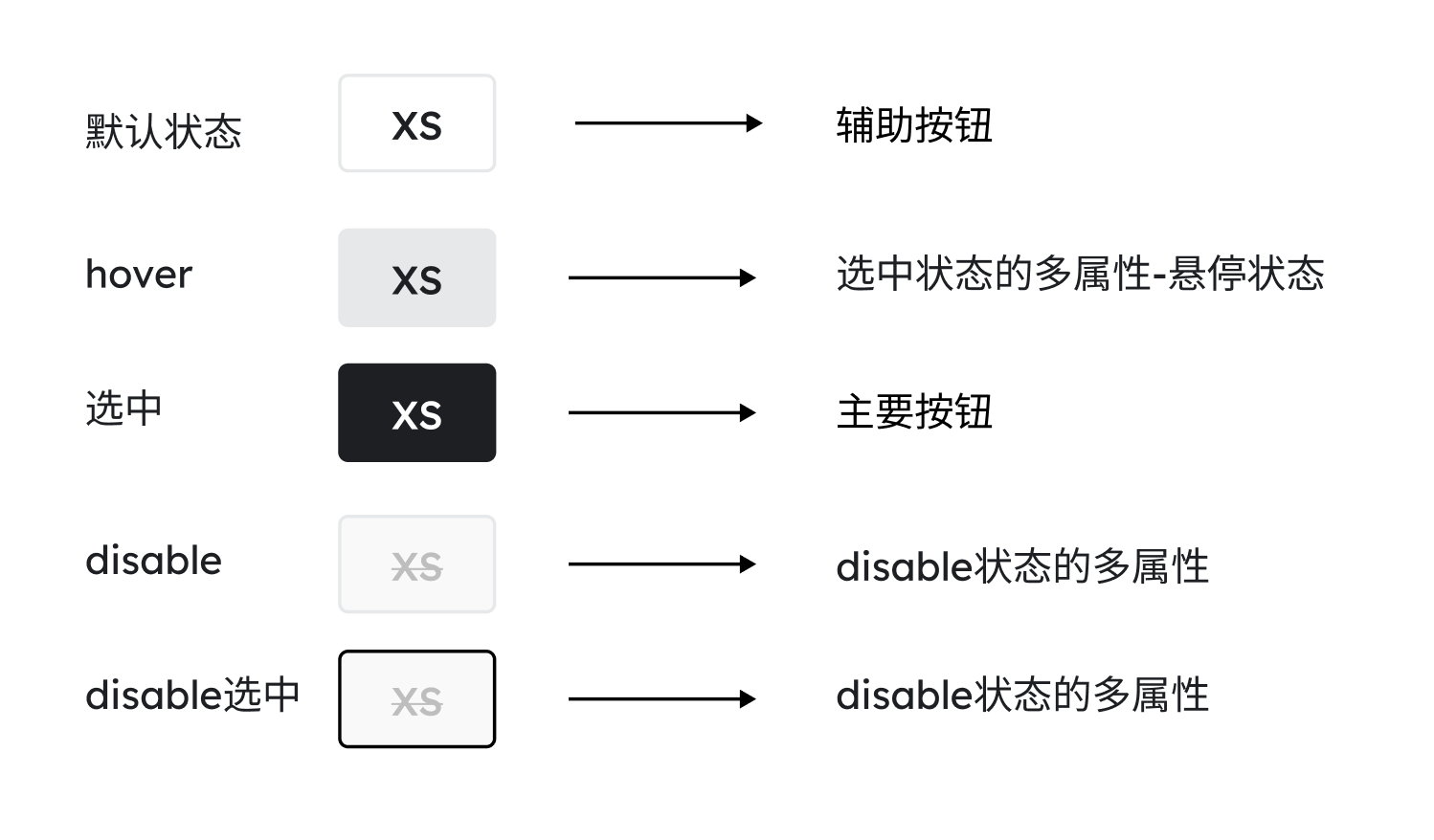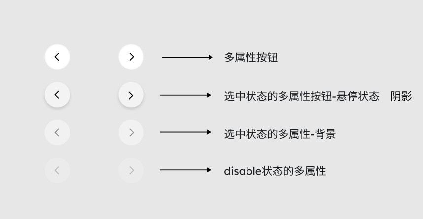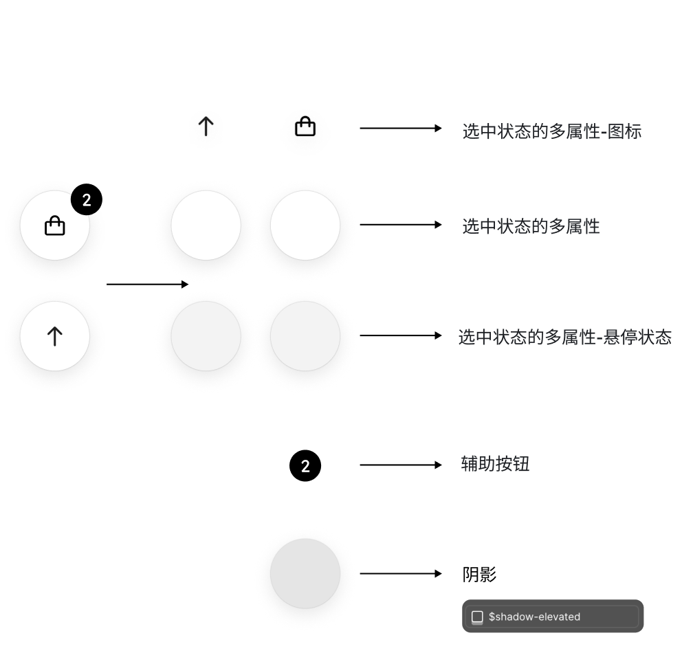 | 变体选项 | 辅助按钮、选中状态多属性、主要按钮、禁用状态 | ![]() | |