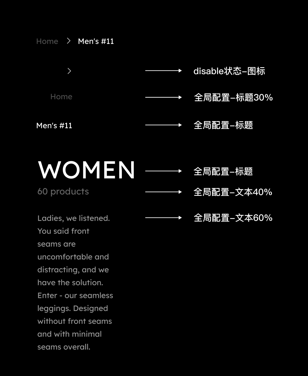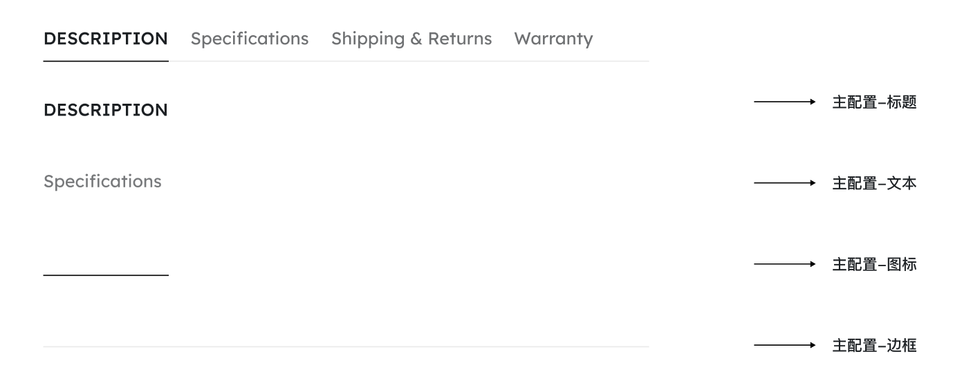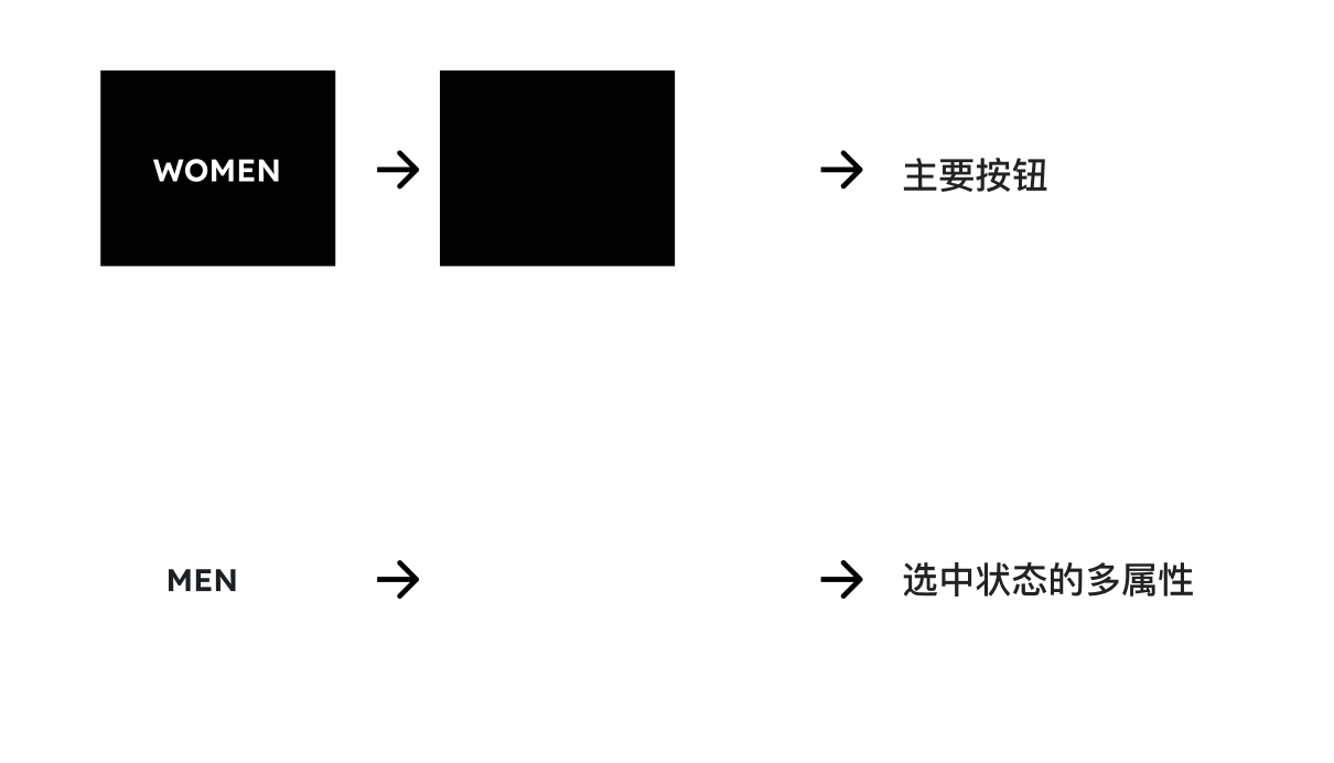 选中状态多属性 | 背景、文本、悬停背景、悬停文本 | 存在选中状态的模块的配色,如选中的菜单 / 尺码 / 站点切换按钮 |