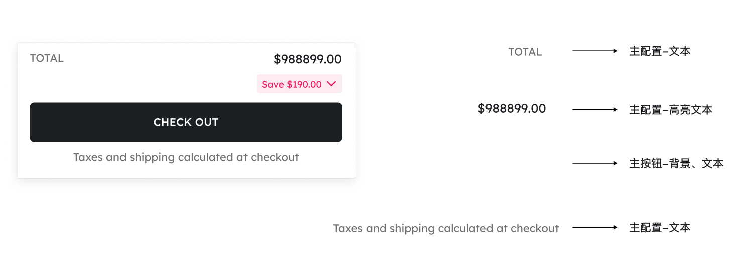 主要 / 辅助按钮 | 背景、文本、边框、图标 | 全站的文字按钮,如加购 / 结账 / 卡片的按钮、辅助链接按钮 |