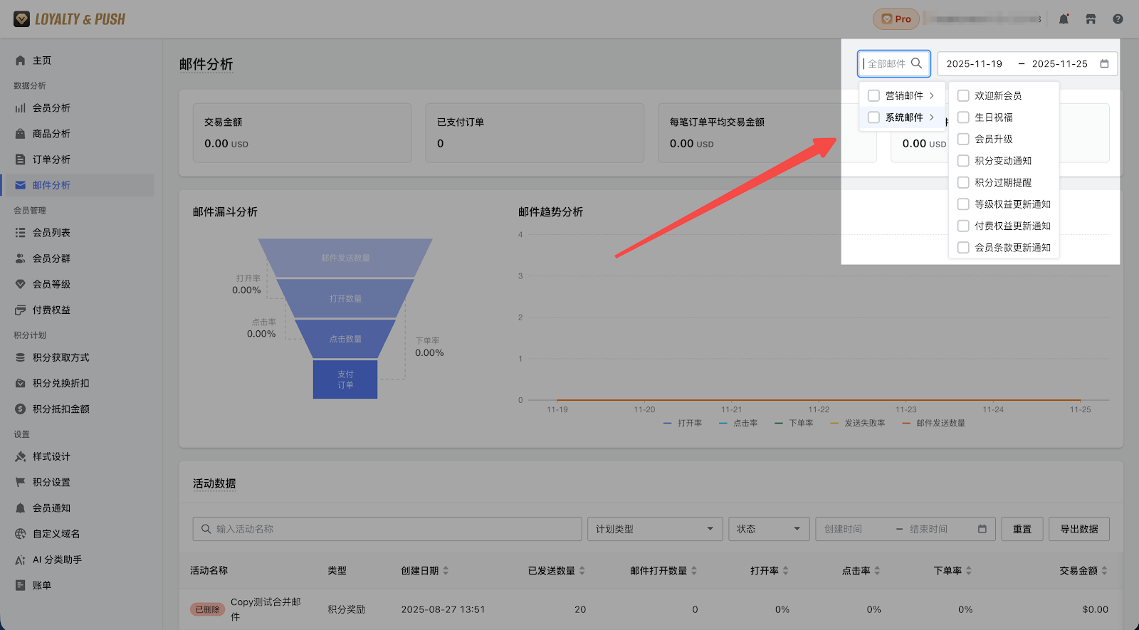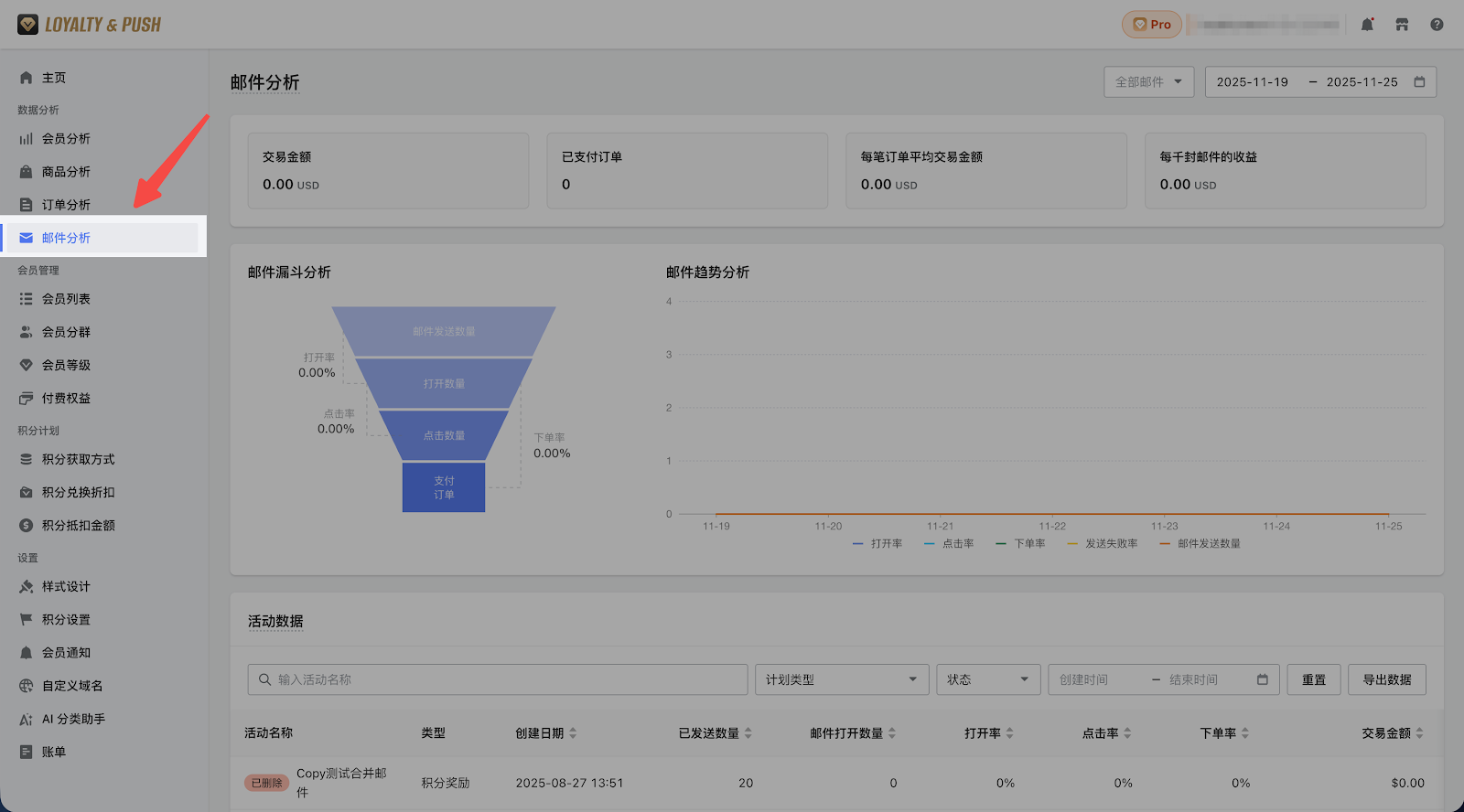 1. 打开您的 Loyalty&Push 管理后台,点击数据分析 > 邮件分析进入数据统计页面查看。