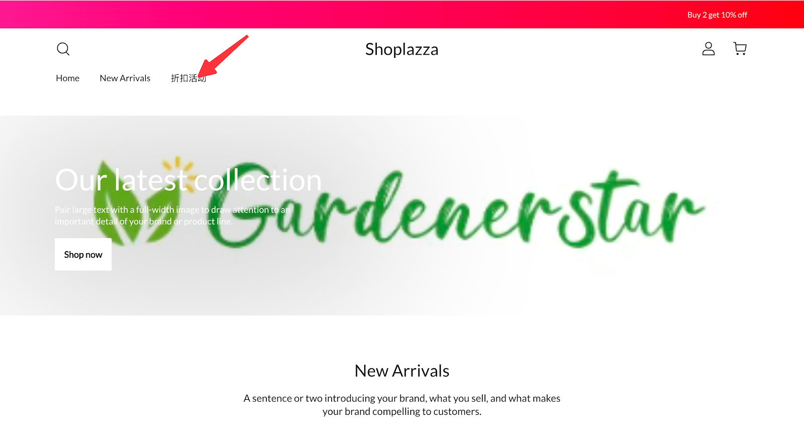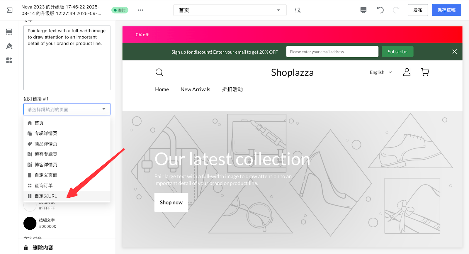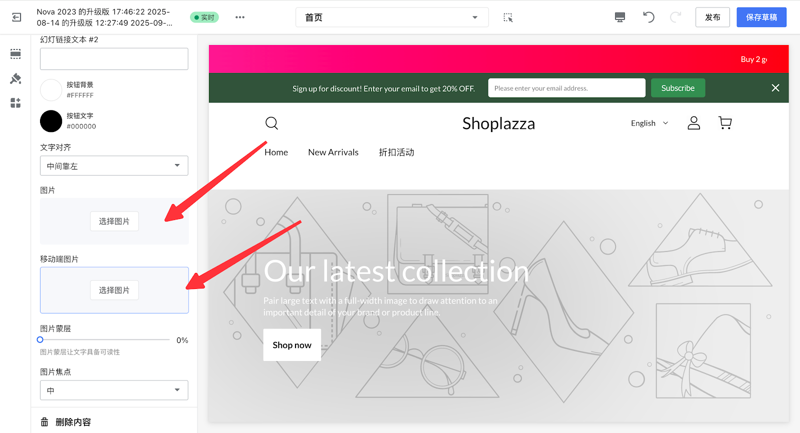 5. 点击图文幻灯下的【Our latest collection】内容,可以插入PC端和移动端的活动banner图。