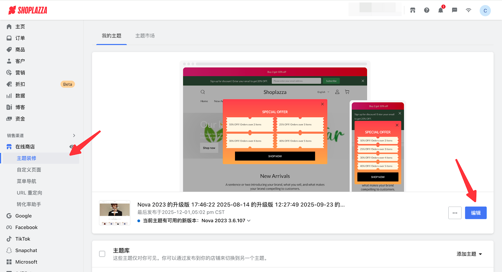3. 登录到您的Shoplazza管理后台,点击在线商店 > 主题装修 > 编辑,进入到主题装修页面。