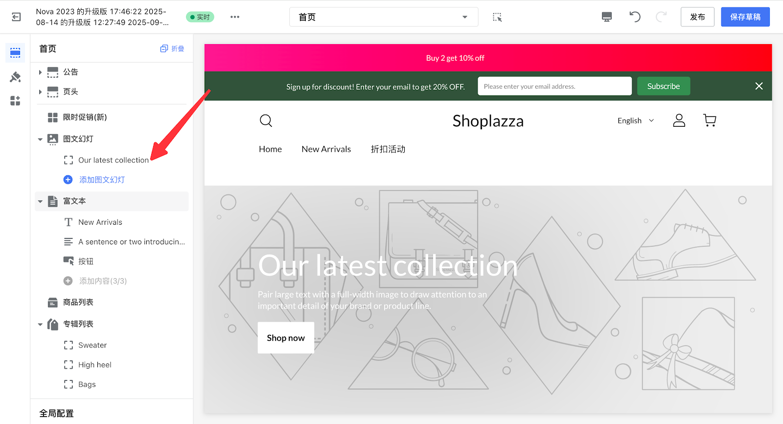 4. 以【图文幻灯】卡片举例,点击【图文幻灯】下的Our latest collection。