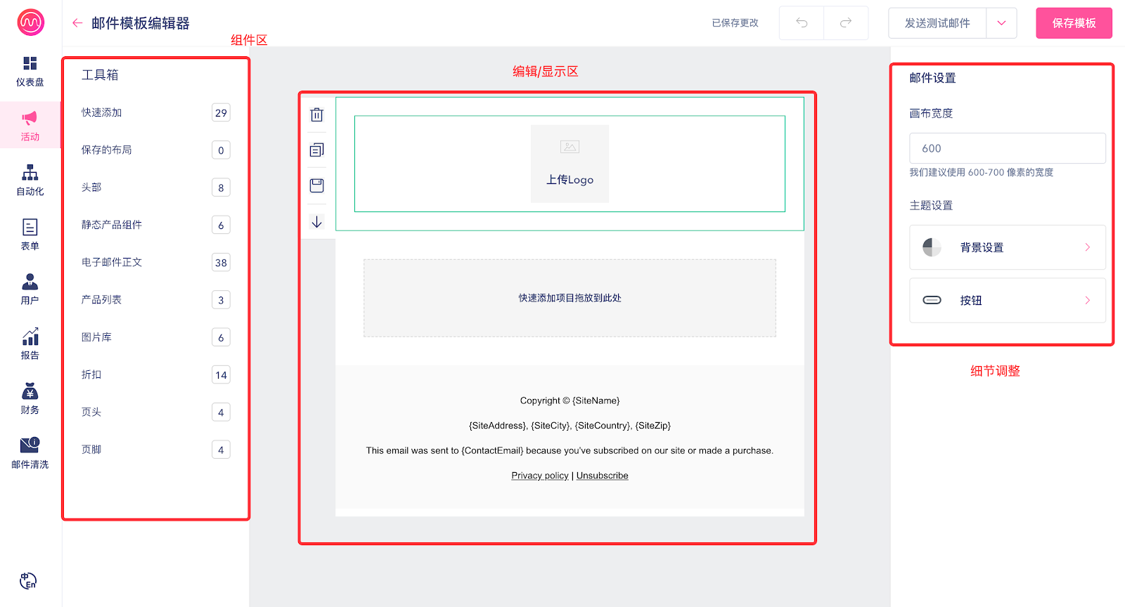 邮件编辑器内包含文本、按钮、图片等多种丰富组件,具体组件的使用方式可参考:Mamba SMS官方文档 。