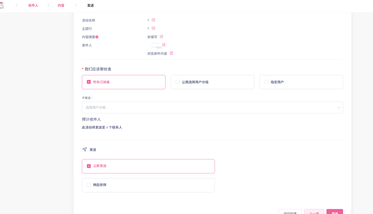 7. 确认发件信息无误,选择需要发送的用户,选择时间立即发送或是预定时间,点击发送即完成。
