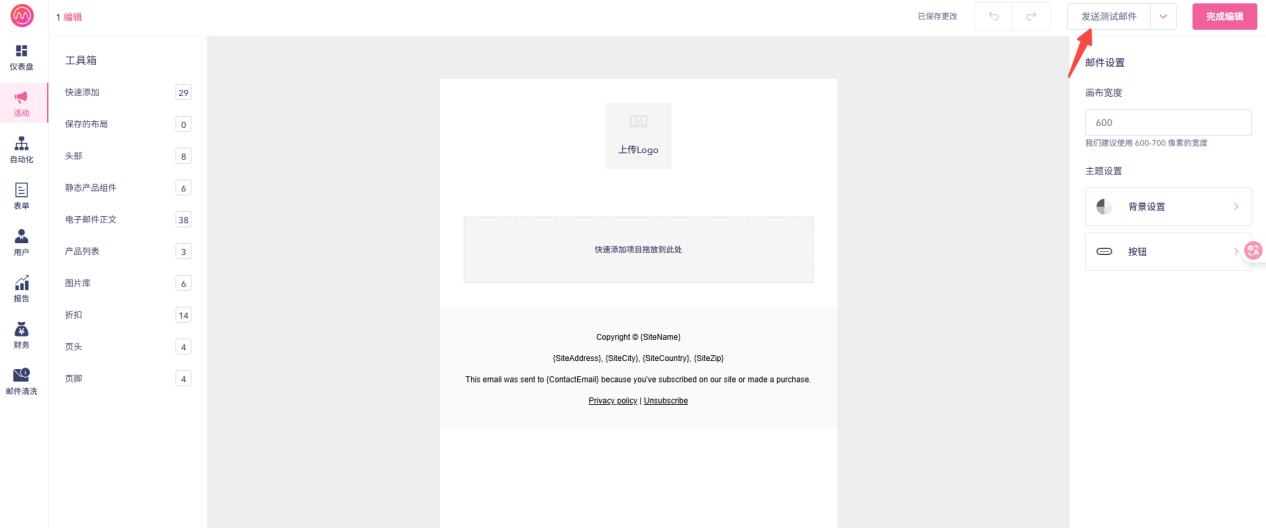 6. 进入邮件编辑页面,邮件编辑器功能请参看邮件编辑器文档。编辑之后,点击右上角发送测试邮件确认无误,则点击完成编辑。