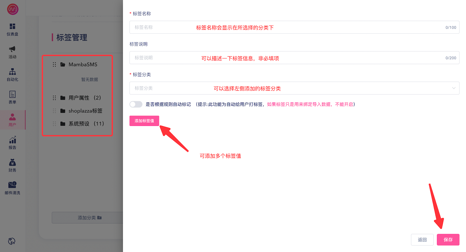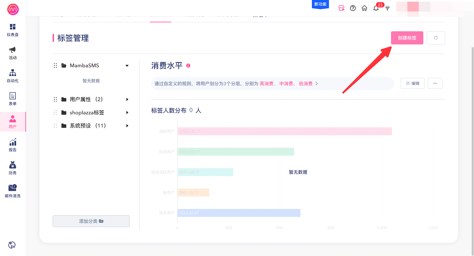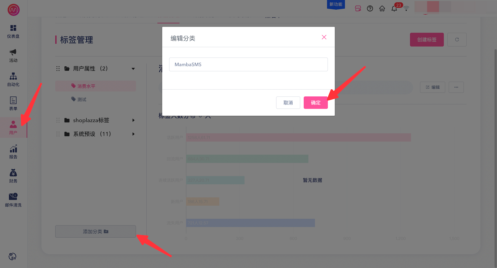 1. 首先点击左侧导航栏 > 用户,然后选择标签管理。在左下方,点击添加分类 。输入分类名称,点击确定(已经添加过分类可以忽略)。