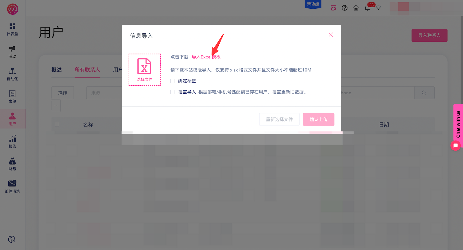 4. 点击选择文件,然后选择需要导入用户的文件。勾选绑定标签,选择刚刚创建的标签与标签值,最后点击确认上传。