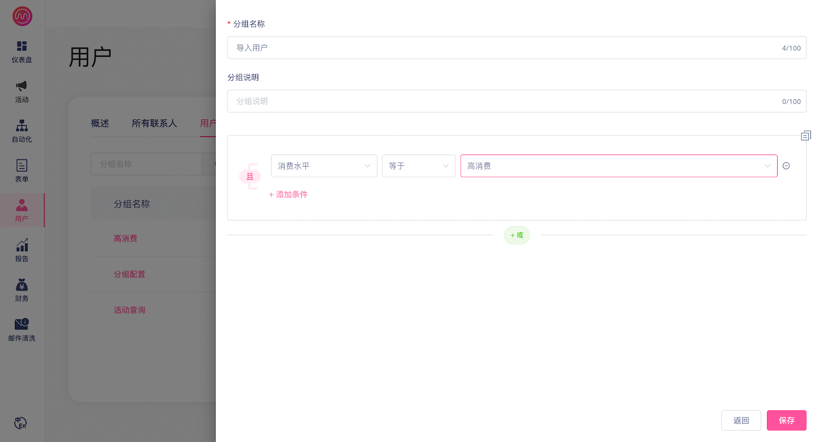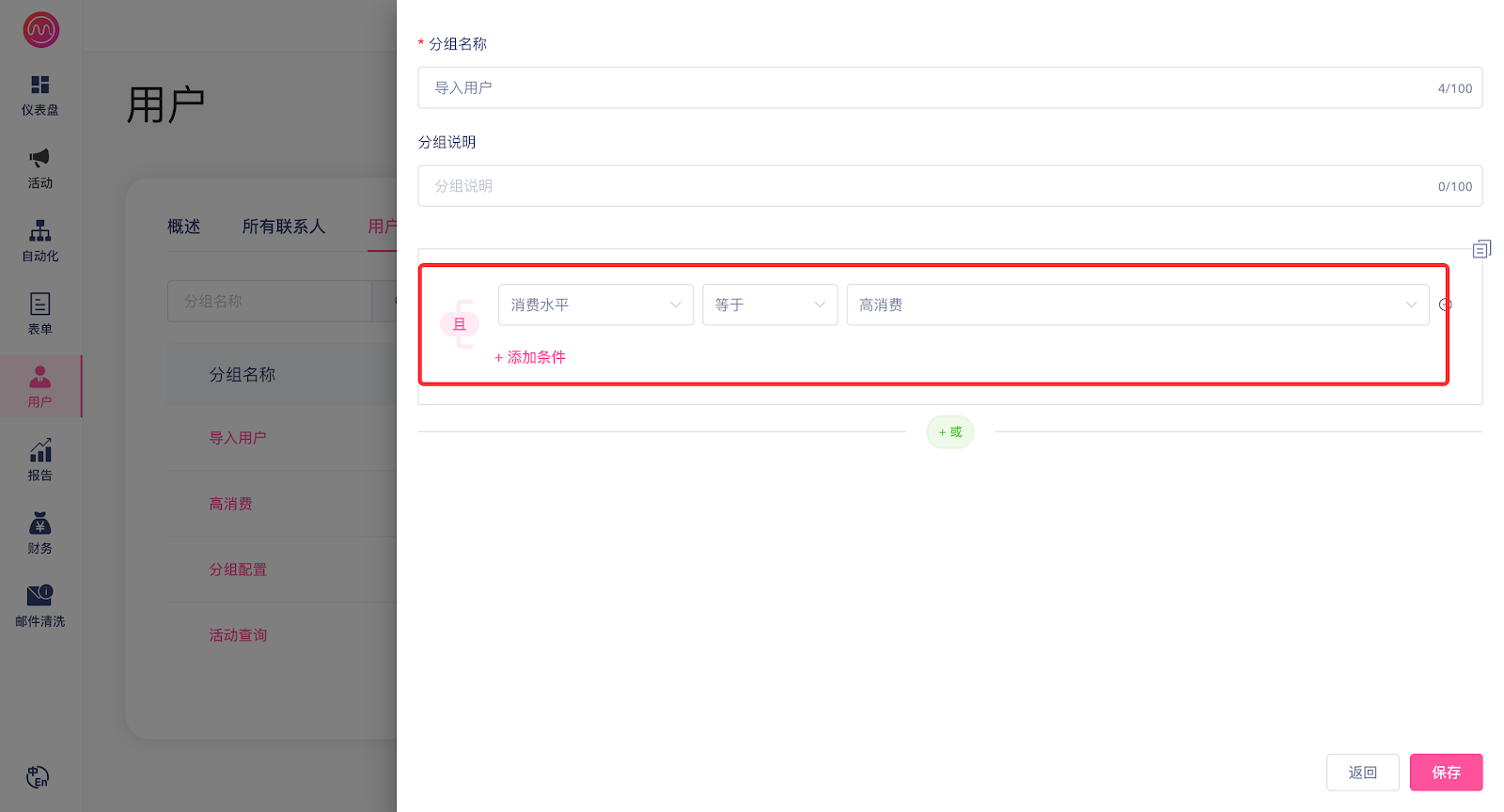 2. 在分组条件里面选择您设置的标签条件,(本文以高消费为例)最后选择保存。