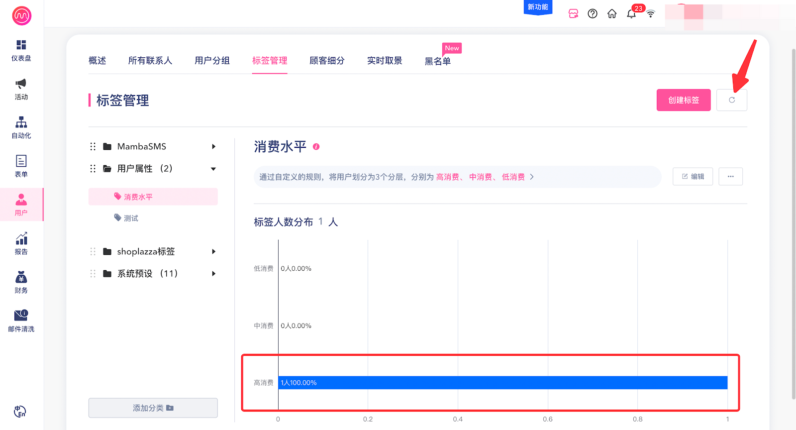 5. 回到标签管理,可以查看刚刚上传的用户,如果显示数量不对,点击右上角刷新。