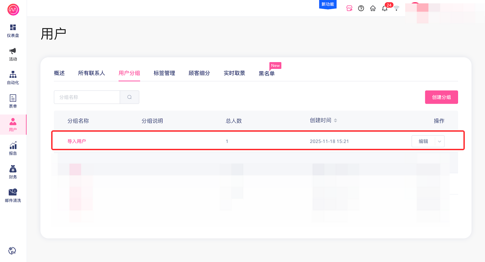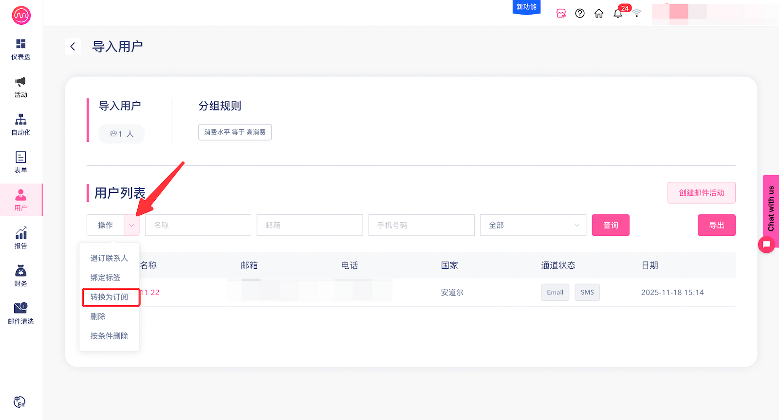 3. 在您发送活动之前,请先检查用户是否订阅,如果未订阅,可以点击此分组,点击操作选择转换为订阅,勾选用户列表下的所有用户即可。
