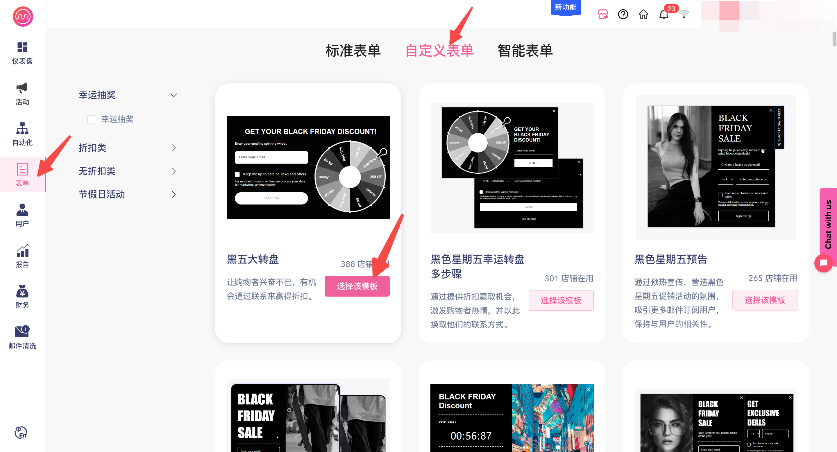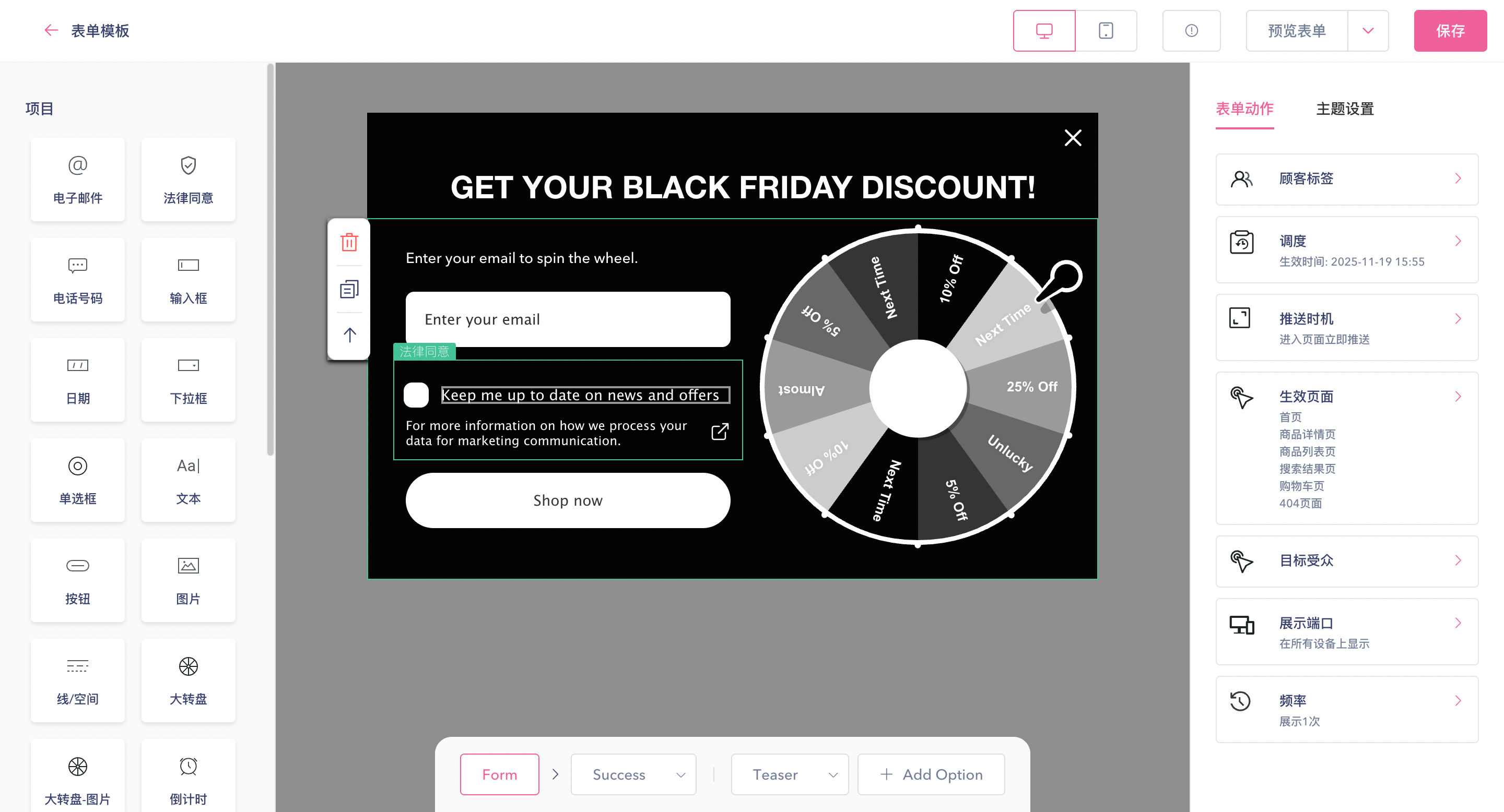 要创建弹出表单,选中表单 > 新增表单 > 自定义表单 > 选择模板。表单库中提供了各种弹出表单模板来满足您的需求。您可以编辑表单内容并进行调整以适合您的网站和品牌风格。表单生成器的主要功能是项目、布局、表单动作和主题设置。