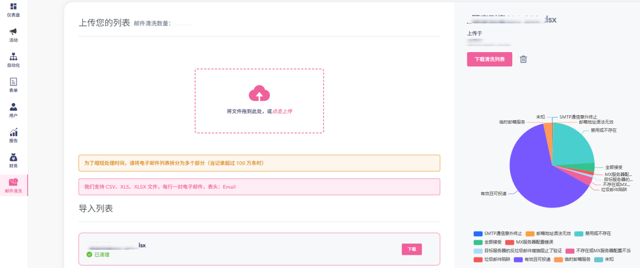 2. 上传需要清洗的用户邮箱,表格包含的字段中只需要 Email 。点击下载,可以看到对应邮箱有不同的标记,建议只保留ok和ok _for _all的标记的用户。