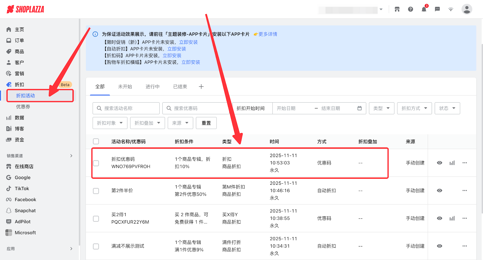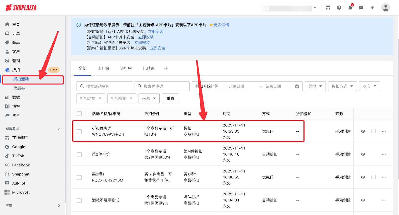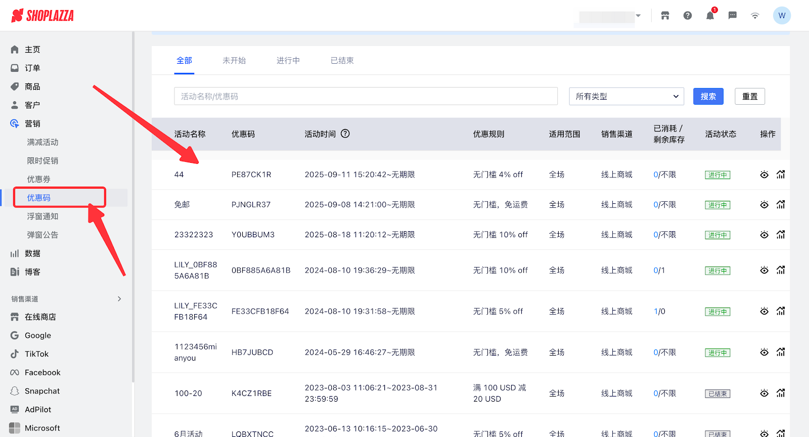 1. 登录您的Shoplazza管理后台,点击 营销 > 优惠码 ,选择优惠码活动。