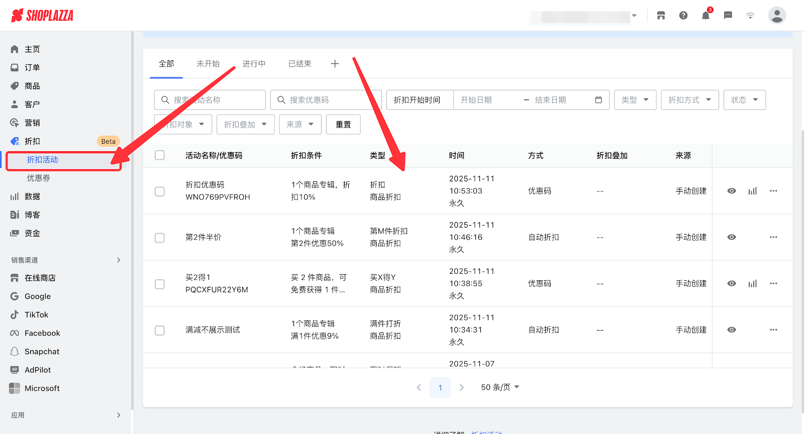 1. 登录您的Shoplazza管理后台,点击折扣 > 折扣活动,点击您设置的活动。