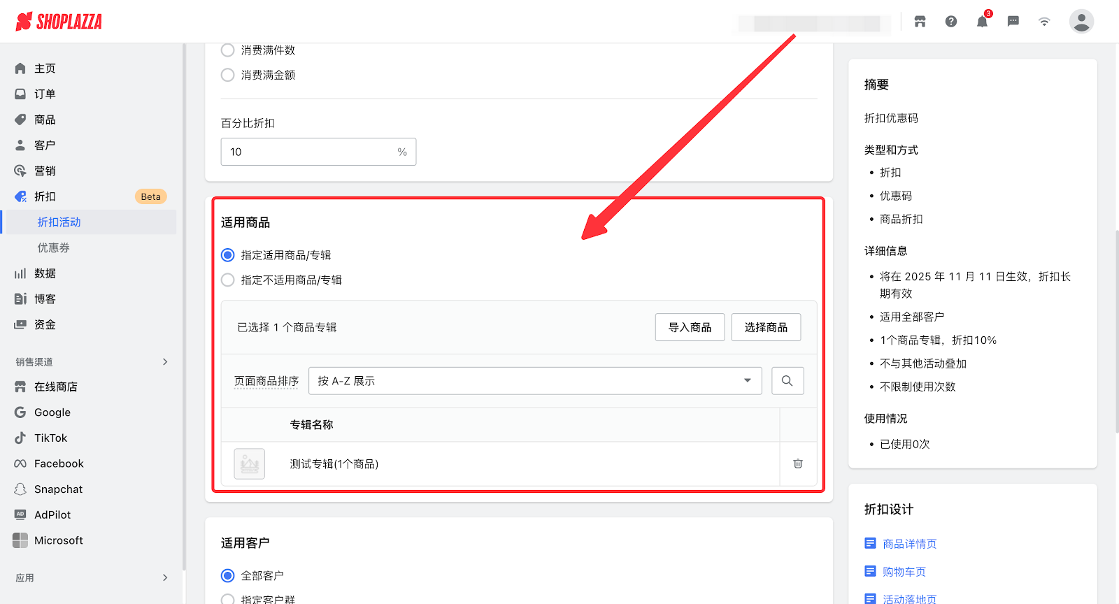 2. 进入活动设置详情页面,下滑找到适用商品模块,确认商品是否在活动范围内。(其他活动的商品范围排查等同此方式)