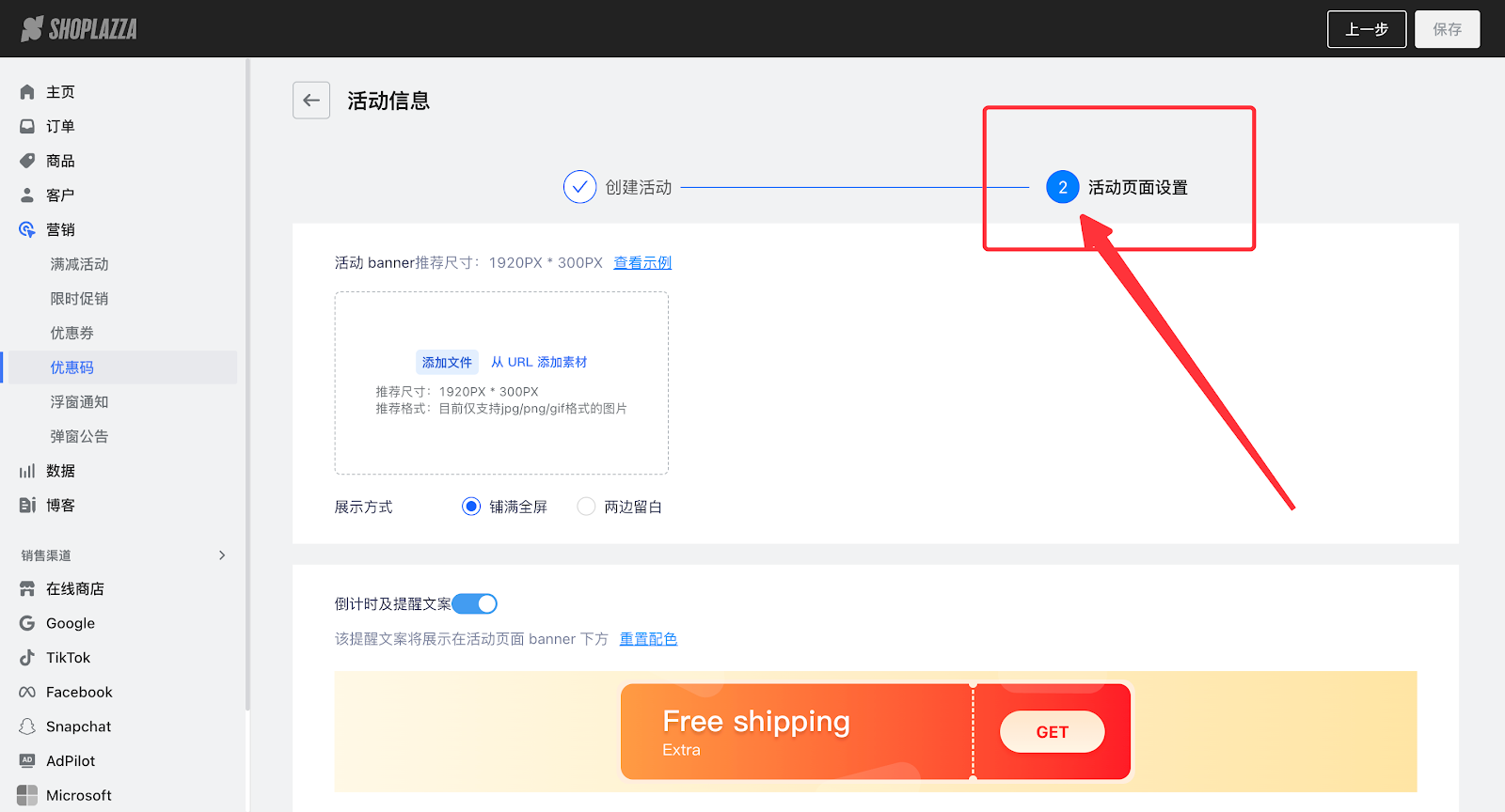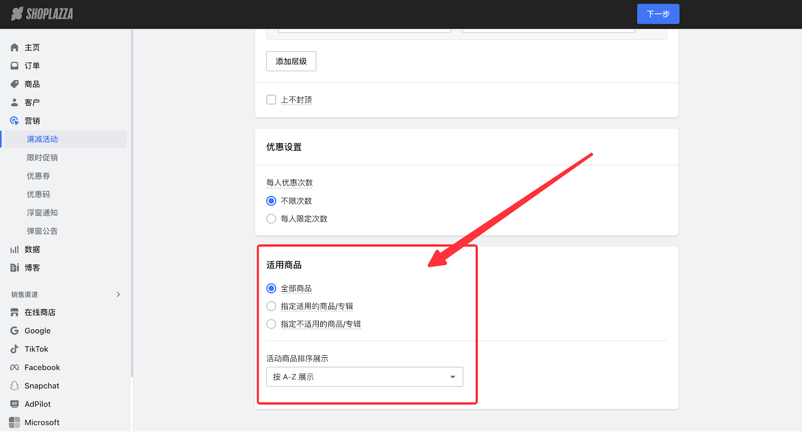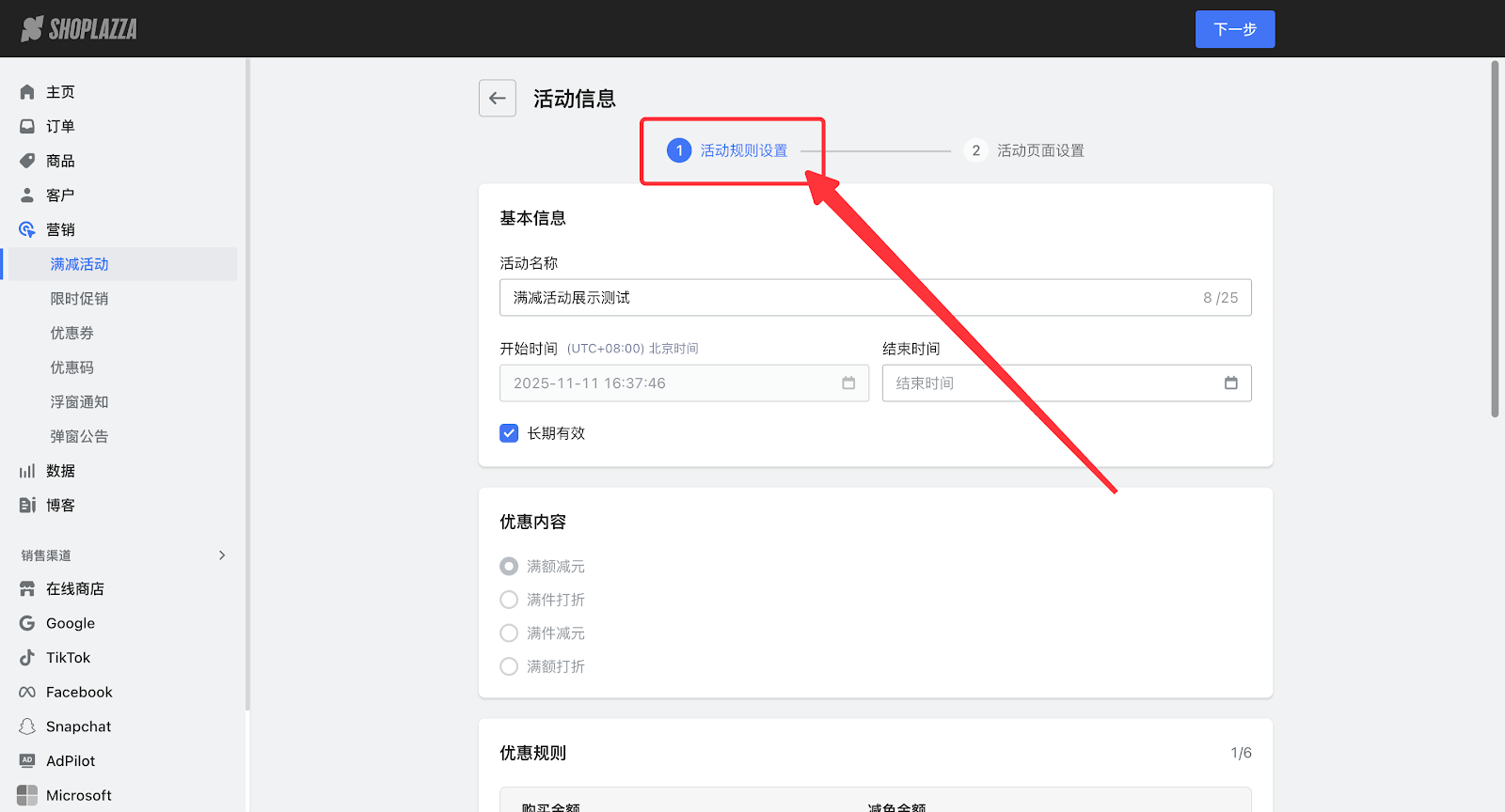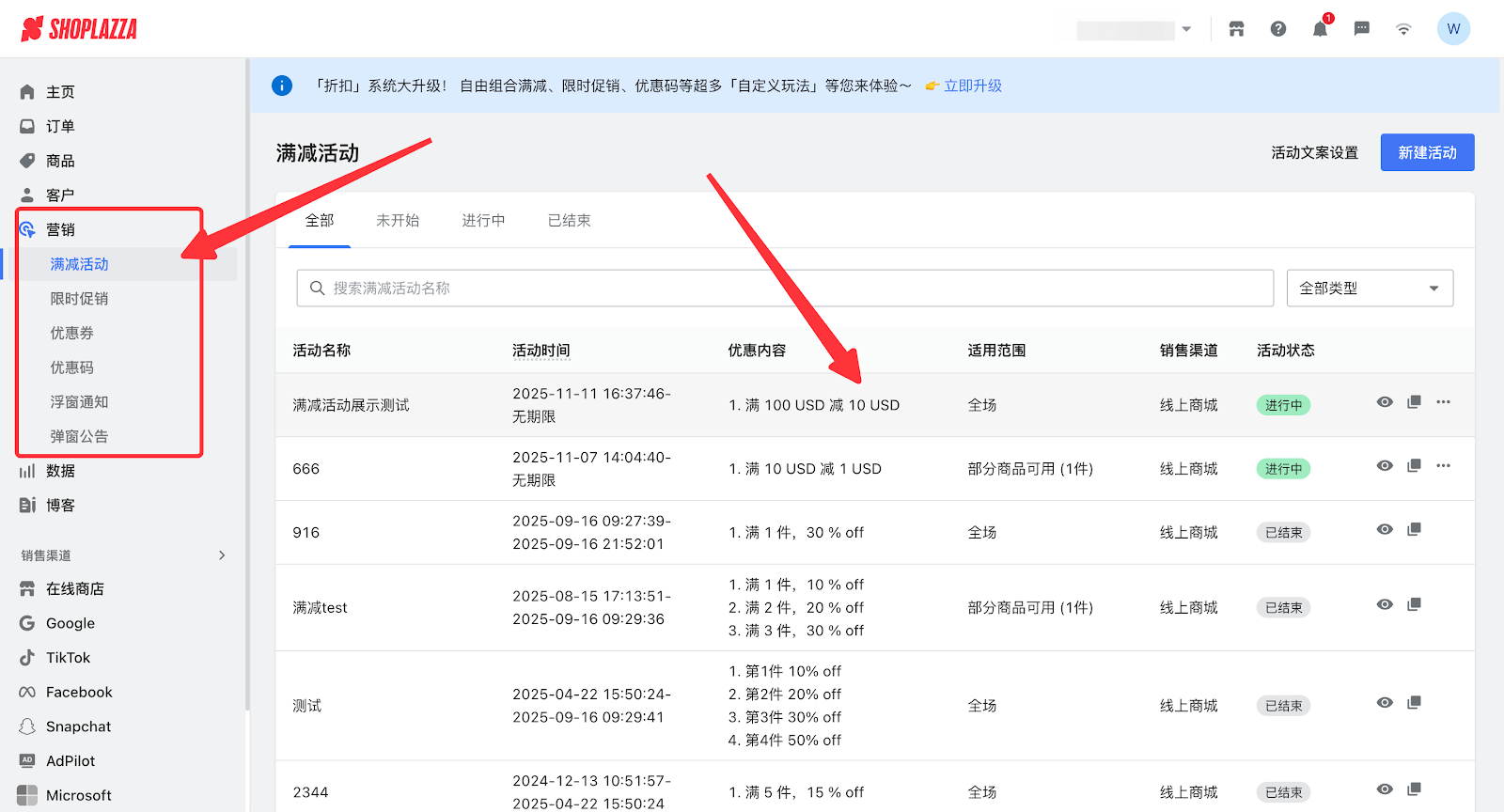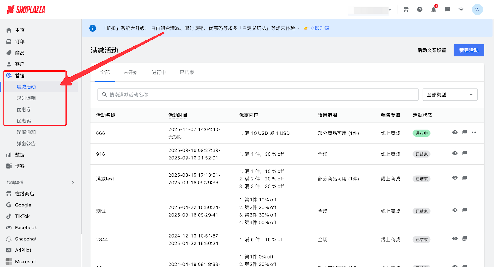 1. 登录您的Shoplazza管理后台,在营销模块,选择您所设置的活动。