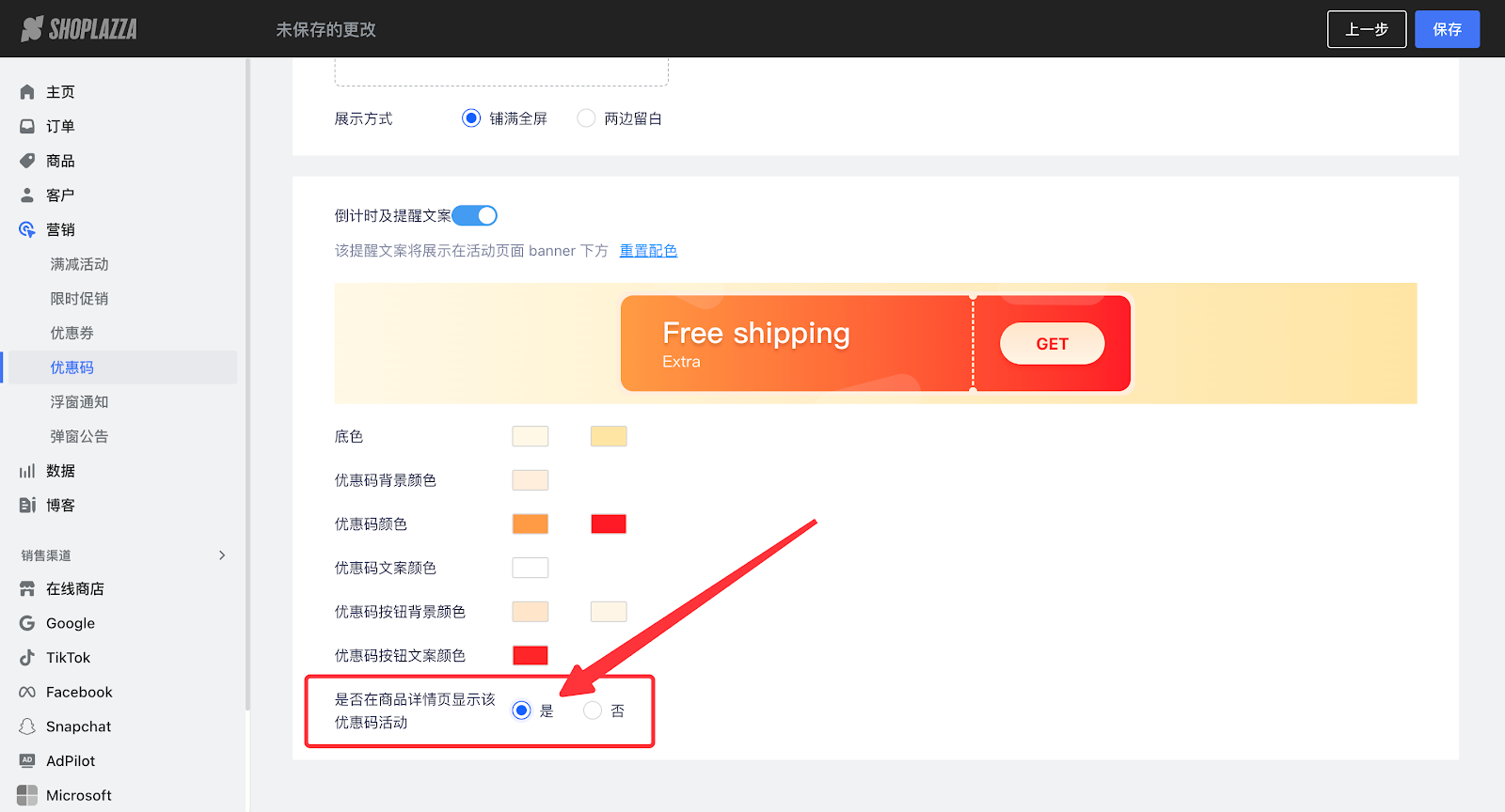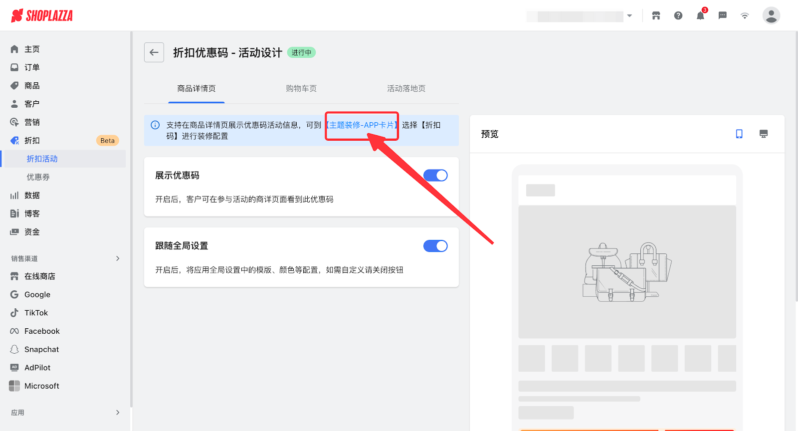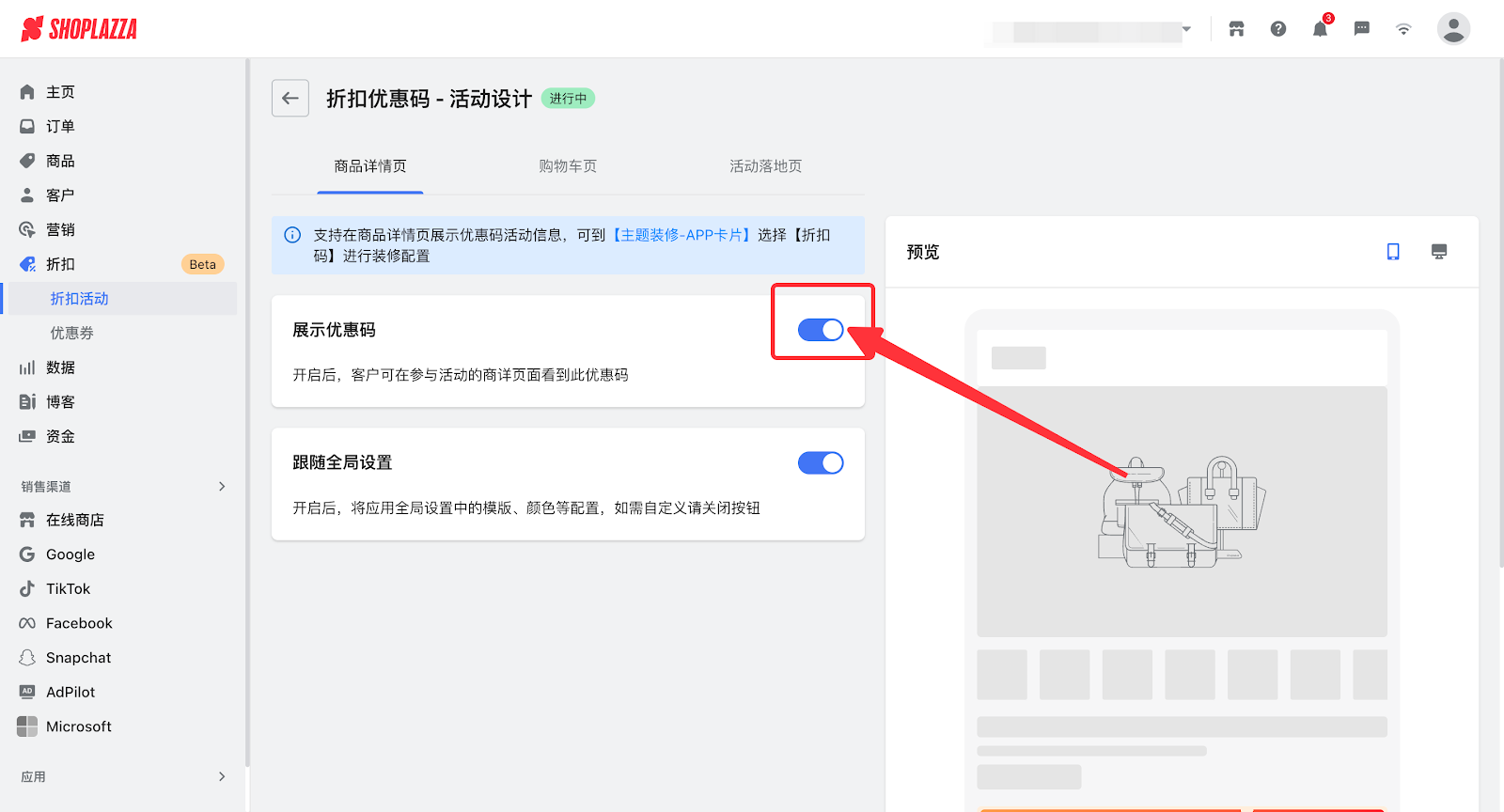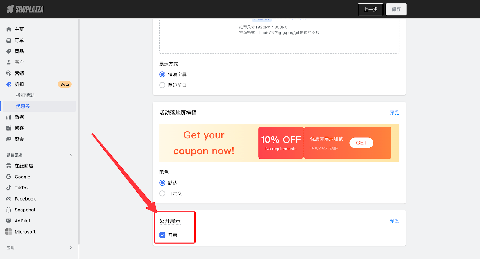 旧版营销活动中,如已经添加卡片,但还是没有展示优惠,需要检查是否在后台开启优惠码展示按钮: