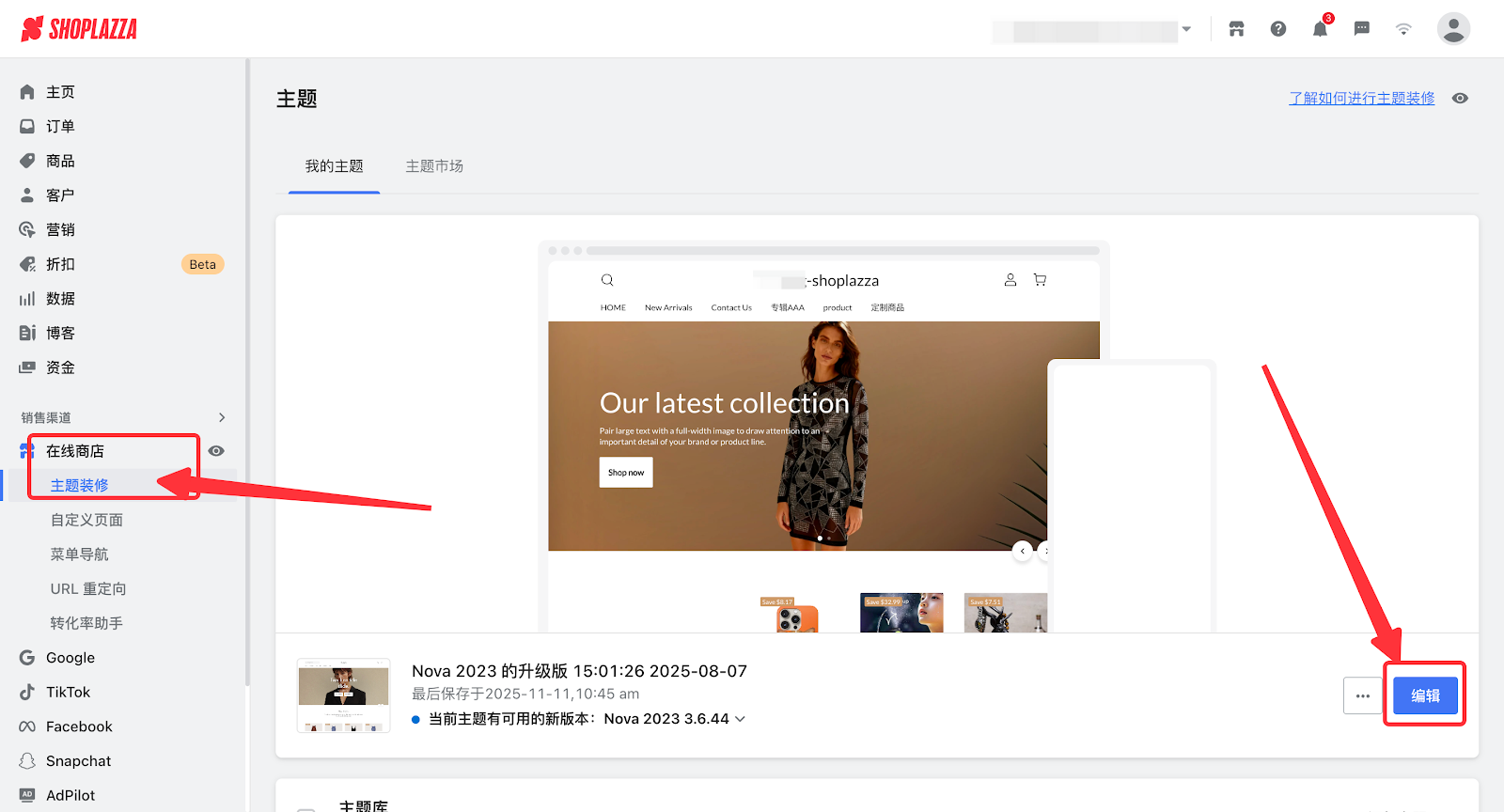 1. 登录您的Shoplazza管理后台,点击在线商店 > 主题装修,点击编辑,进入主题装修。