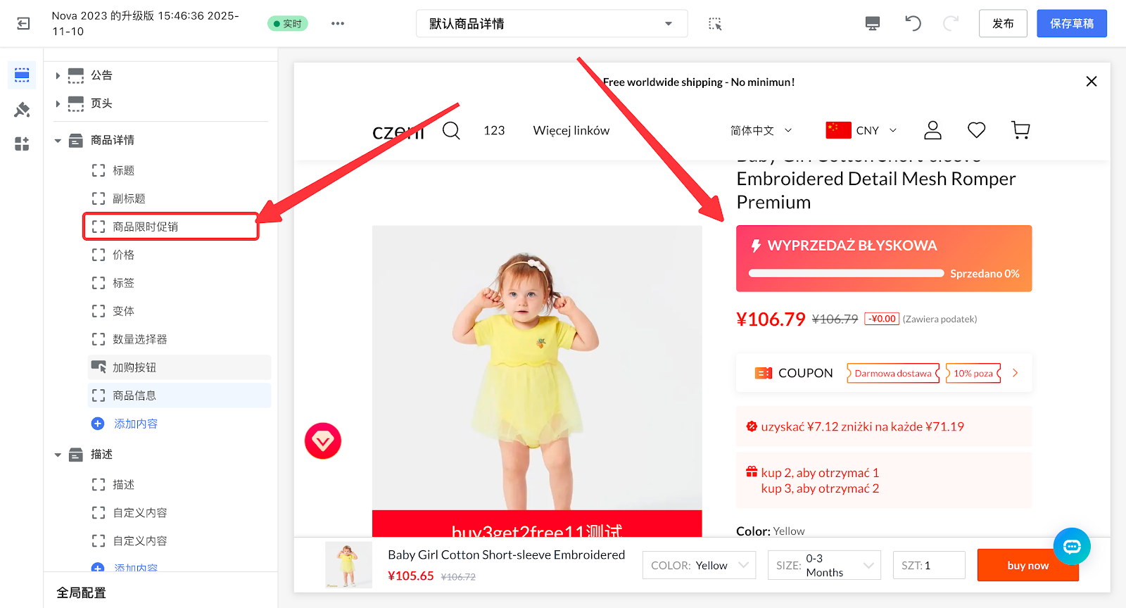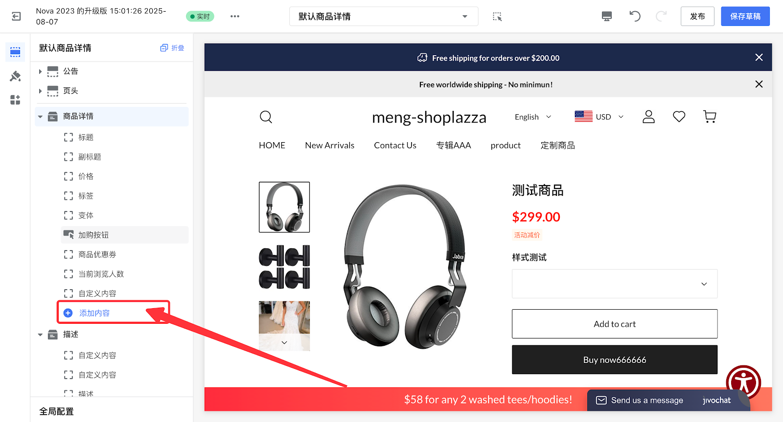 3. 商品详情页>商品详情模块,点击添加内容。