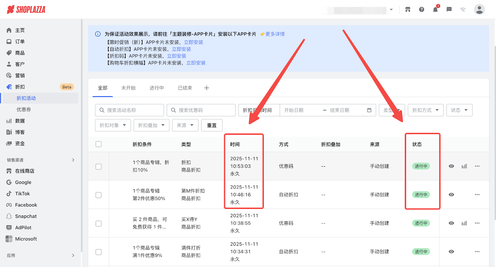 登录您的Shoplazza管理后台,点击营销,选择您设置的活动类型,看活动时间是否在有效期内,也可查看活动状态是否是在进行中。(其他活动的时间排查等同此方式)