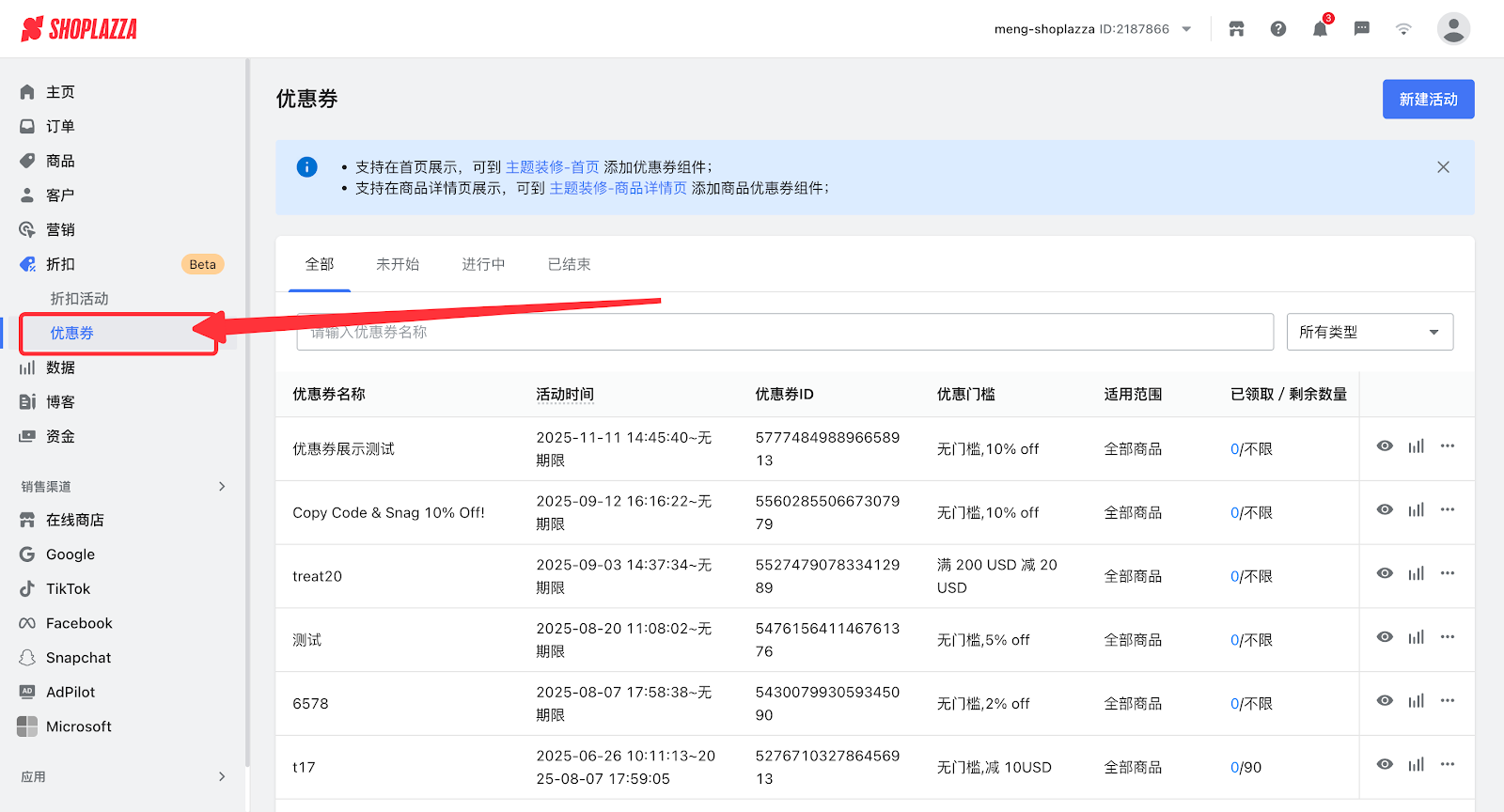 1. 登录您的Shoplazza管理后台 ,点击 折扣 > 优惠券,点击您设置的优惠券活动。